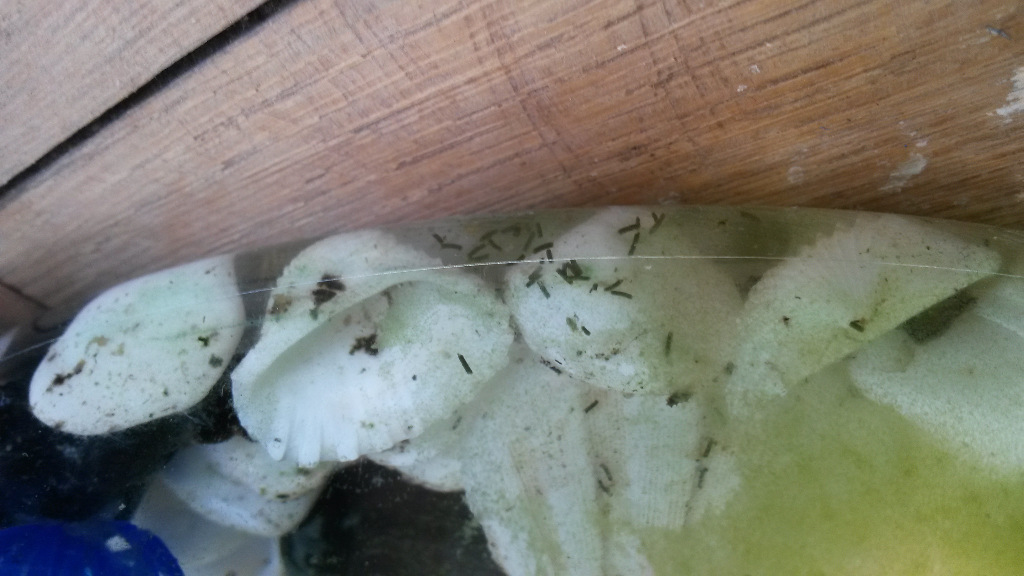 So I had to know if Fred is alive, so about a week ago I started removing things from his setup until I saw him. I know....I am an ass :} Still translucent but seems to be doing fine. I added 2 snails I got from our local fish store, Bob and Ralph. They are cleaning things up well. My next question is about algae. Are these little sprinkle looking things algae? If so, are they bad? Thanks!!!
