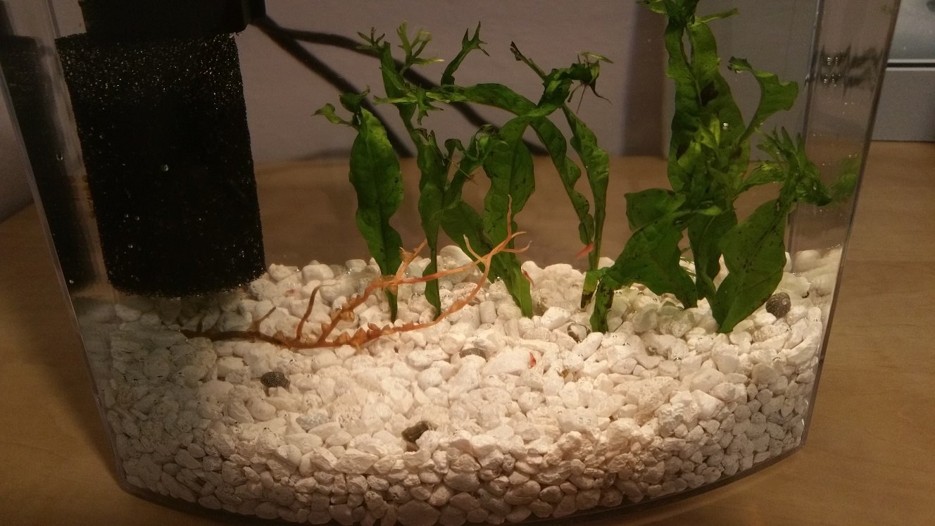 Sooo.. I had 2 small EcoSpheres and lost a couple shrimp in them. The rest had stopped swimming around and just lay on the bottom in a little cluster. I did some googling to see if they were Ok, and I kept reading these spheres were cruel. I went to the local tropical fish place and talked with the owner. He suggested I get a beta tank, some live plants, and a foam filter over the intake and I could keep them in there. He said tap water would be fine if I used 1-2 drops of prime in each gallon.