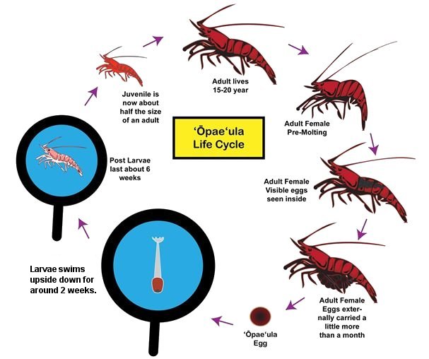 This is an Opae Ula Life Cycle chart I have seen online. In my 1.5 gallon tank I now have several floating larvae (around 20) Plus a few berried females. This chart says the larvae stage lasts around 2 weeks and post larvae around 6 weeks until they become juveniles. With these shrimp living 20+ years and reproducing as they do, my tank will most probebly outlive me!