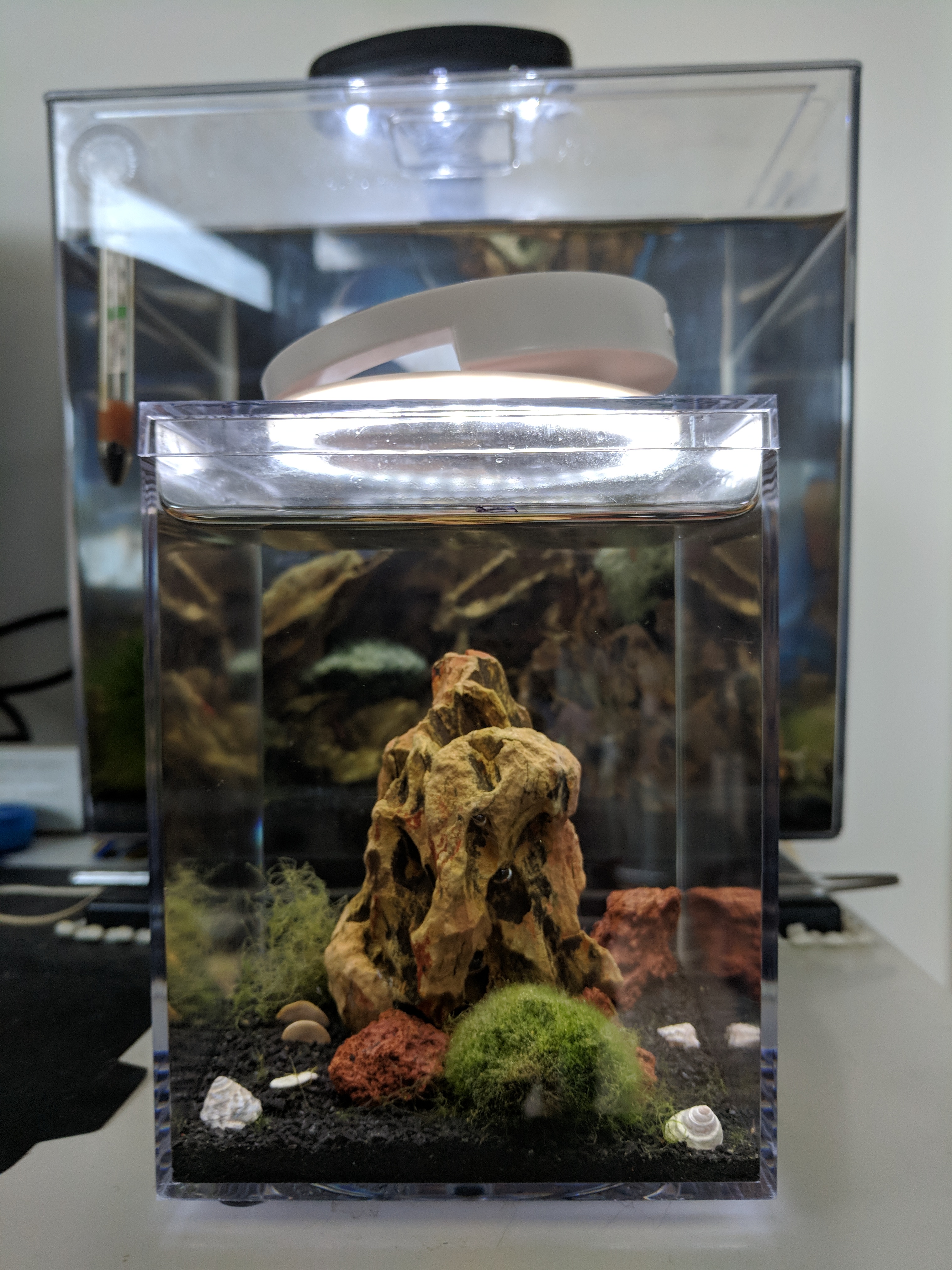 Small tank is doing well, got 6 shrimps in there. Growing slower than their sibblings in the larger one I believe but they're slight pink so I'll take that as a good sign.