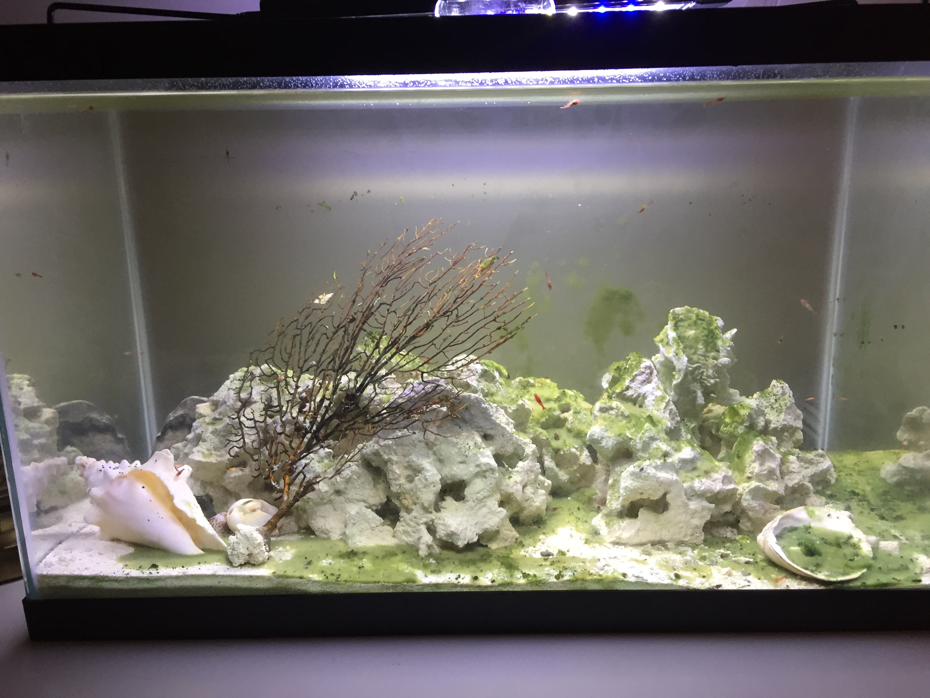 I set up the tank a while ago, cycled it, and grew algae on the limestone rocks and yesterday received my Hawaiian red shrimp order! They are doing well and leaving little trails on the side of the tank in the algae glowing on the sides.