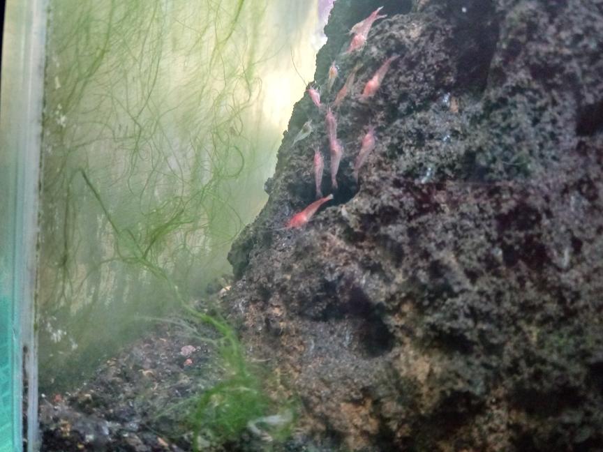 The tank its maturing well, the cyanobacteria and the brown algae its gone, all the 13 original shrimp growing; molting and alive but still not babies