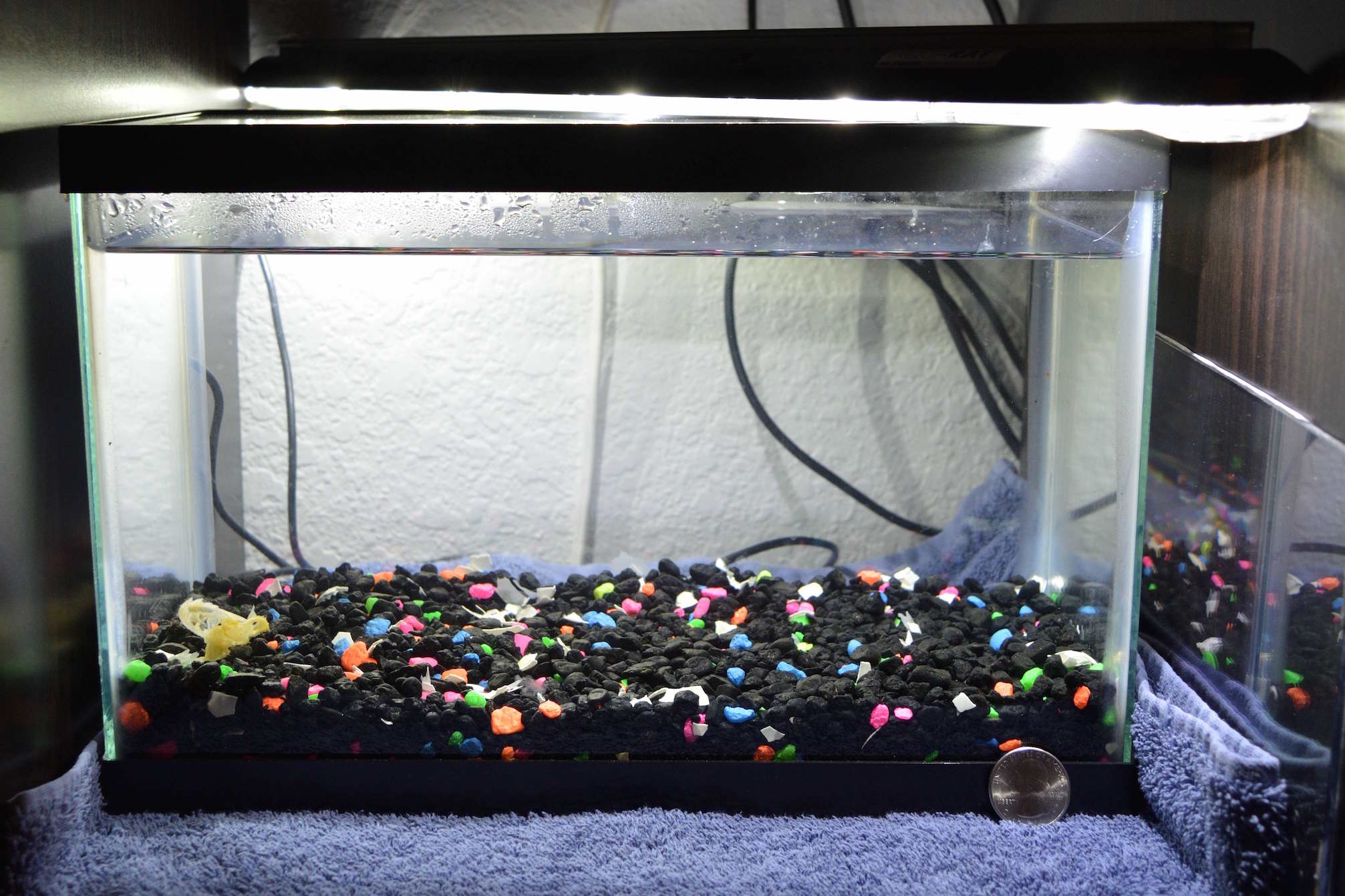 So, I set up a small tank (don't remember how many gallons- it's small, from 1 to 2.5 gallons. Dimensions are about 12" x 6" x 8") with gravel, distilled water and instant ocean- salinity is just about perfect according to the guide. I'm using crushed egg shells as a buffer. I have an AquaRay that was for a bigger tank that I'm not using- so I set it up with the tank and timer on a 12 hour off/12 hours on schedule. I have a Plexiglas cover that was custom cut for the little tank and fits really well.