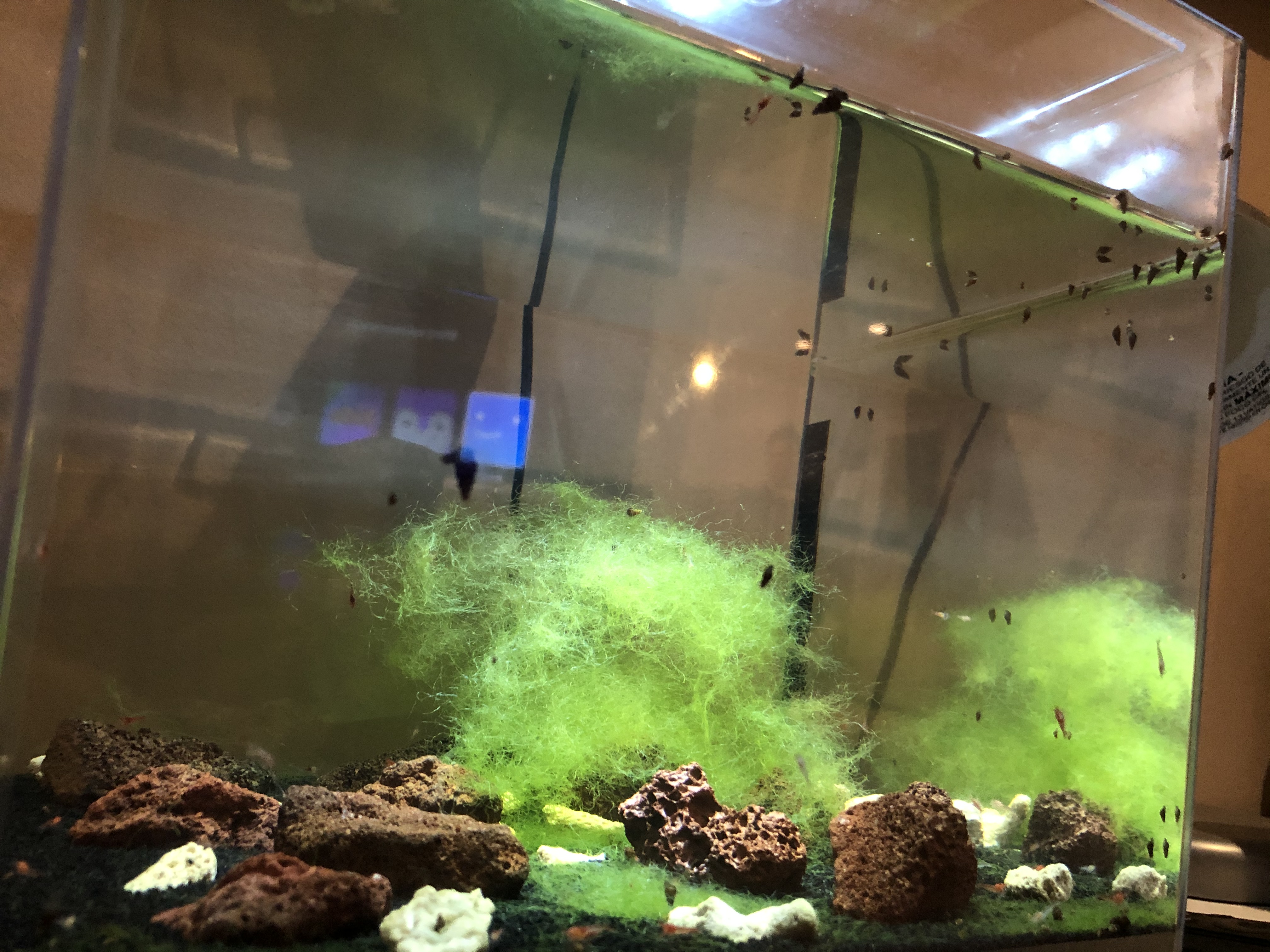 I have 16 adult shrimp, 3 month old young ones, and a horned Nerite snail in my one gallon. There is no visible algae except for the 2 small clumps of macro. I get a little worried about the food supply so they get the amount of spirulina powder that will stick to the outside of a toothpick once a week.