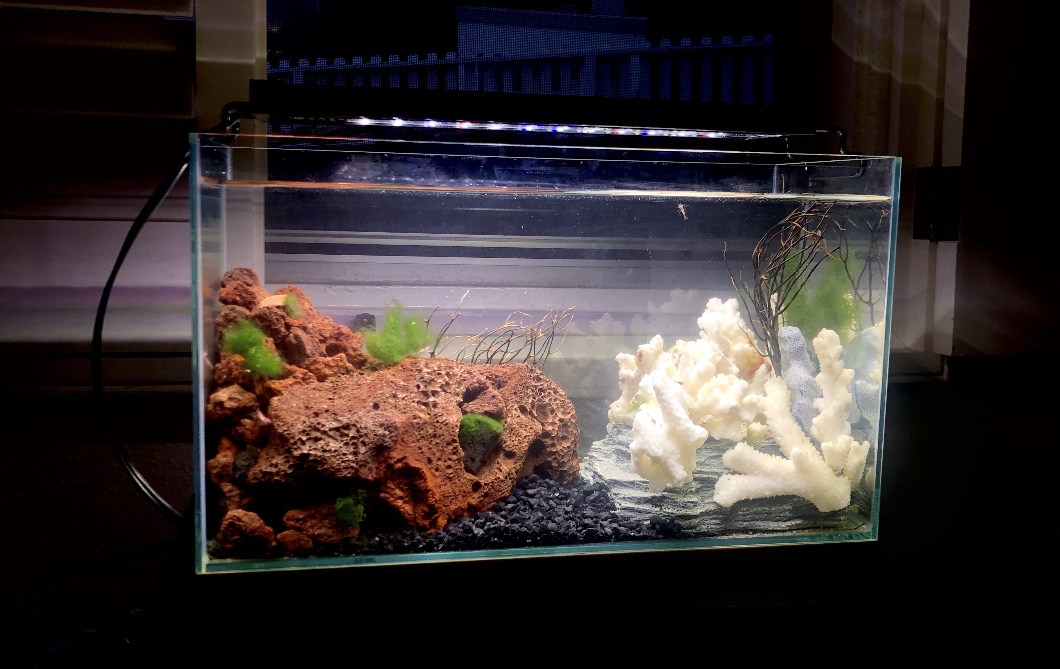 The left side is a tonnn of small/medium lava rocks built up, with one large lava rock cave (the hole is blocked temporarily so I could see them before they hid). The right side is a dish filled with crushed coral, then the large corals placed on top, for both decoration and calcium carbonate. Two sea fans, one old one new. Waiting on a glass top to come. Also a lot of macroalgae from various sellers, mostly Mustafa.