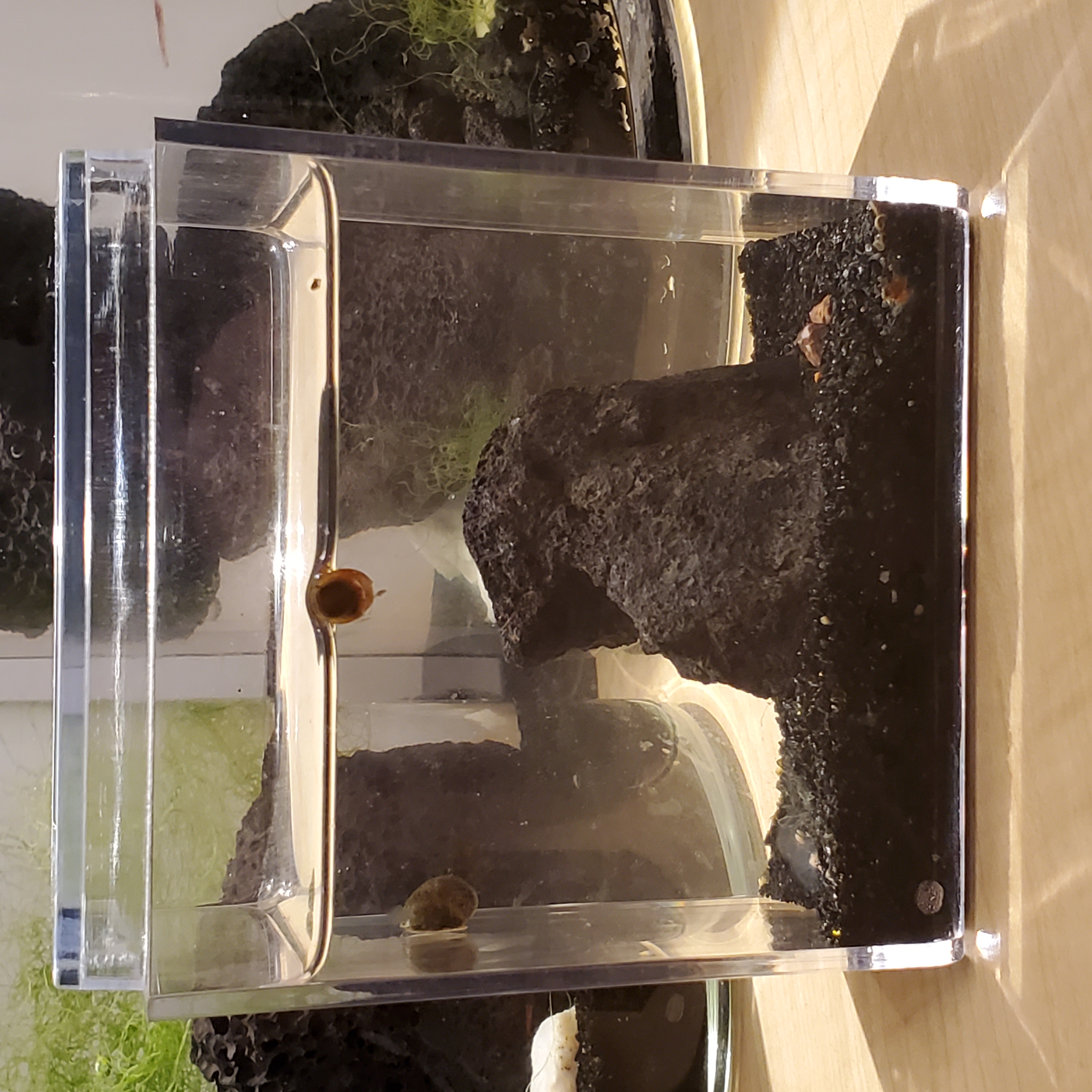 I'm still confused as to why the two snails in the smaller tank are so visible, almost always on the glass, but I can't spot any of the snails in the larger tank (granted there are a lot more hiding places). The snails in the larger tank have either all died (which seems unlikely, as that would have spiked amonia levels), spend all their time under the substrate, or just hang out in areas under the rocks where I can't see them.