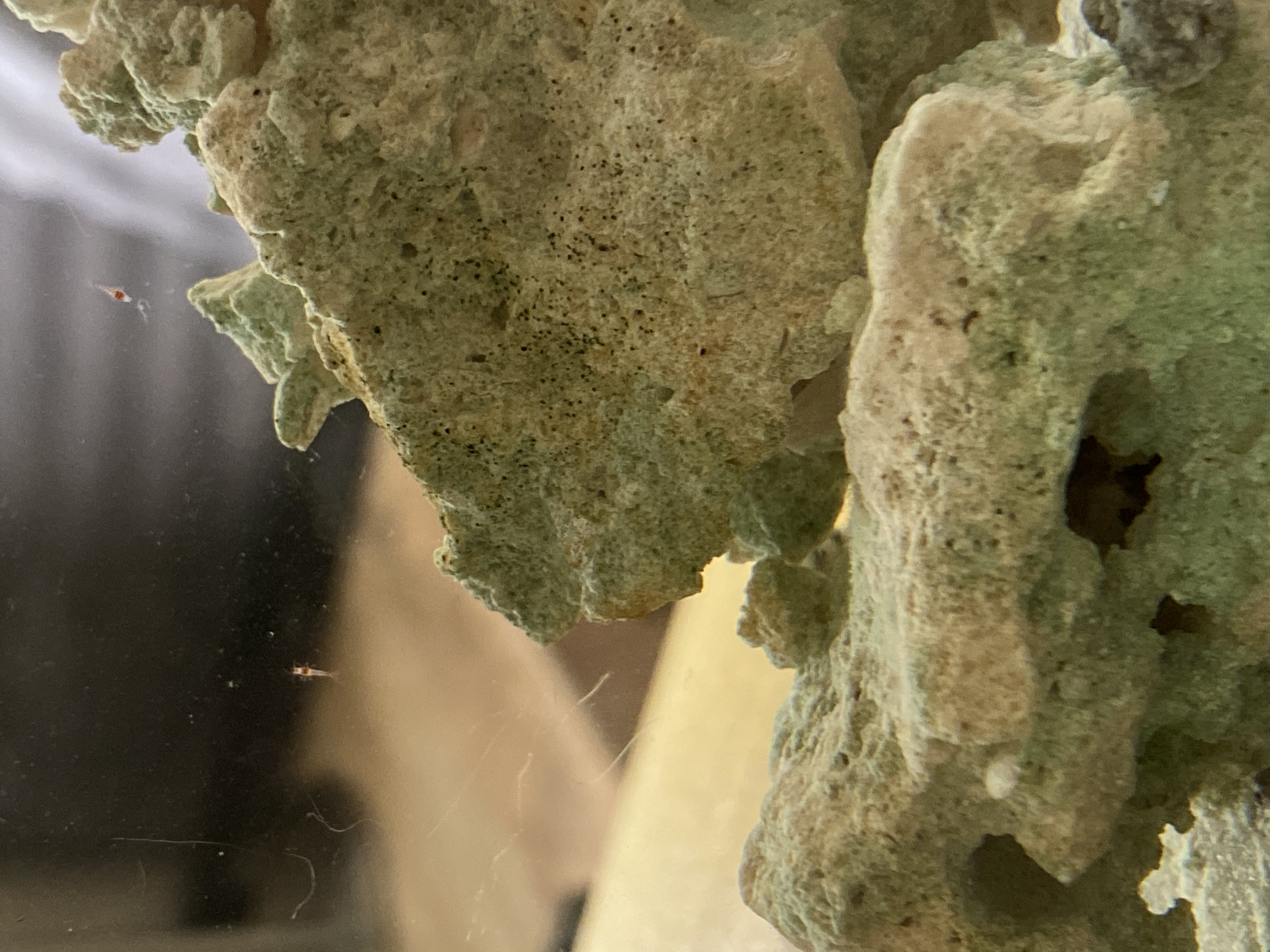 Background: I moved recently, so I combined the shrimp from two one-gallon tanks into a single one gallon tank. Even though the other tank was emptied of shrimp, I left it mostly intact- substrate, coral rock base, sea fan, even the brackish water and snails have been left in there, as is. Just the opae ula were removed and combined into the other tank.