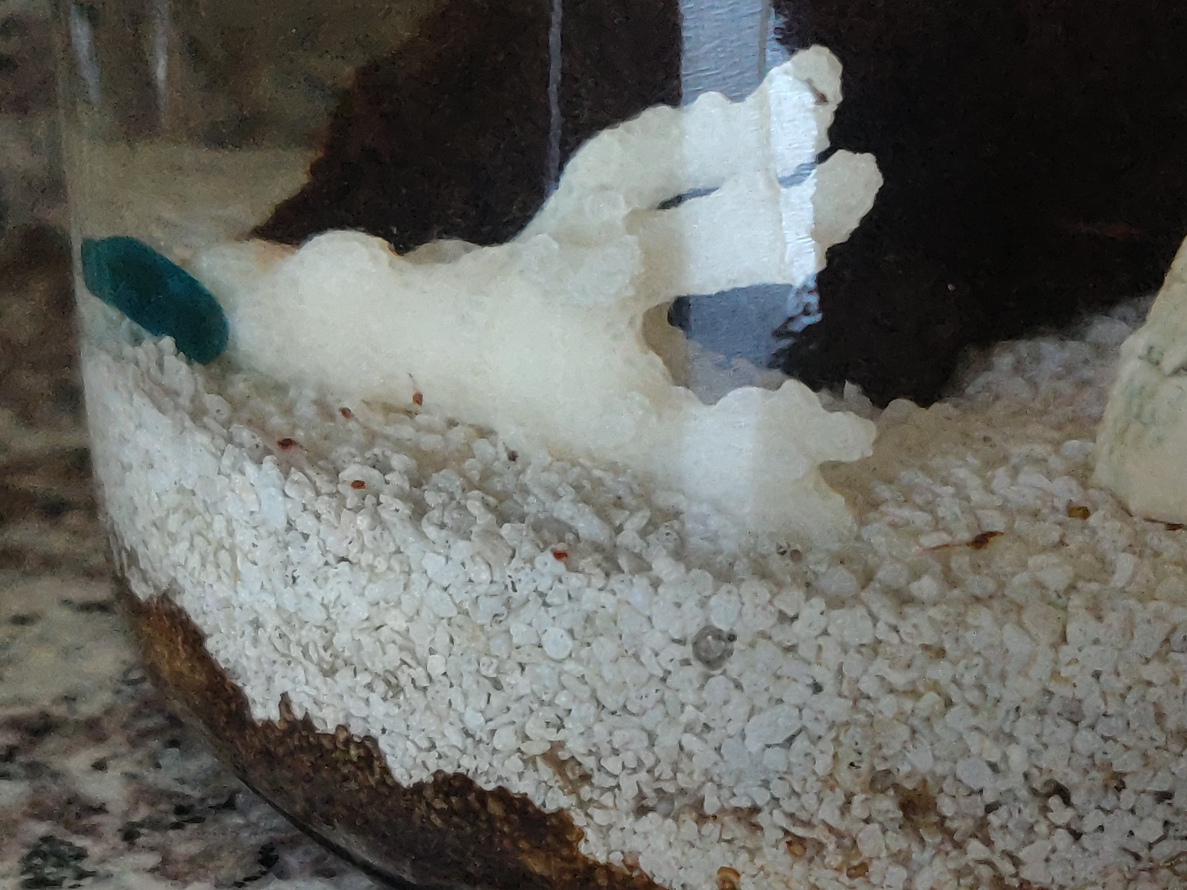 My newer tank is perfectly normal - plenty of green algae, happy shrimp. I do think the most likely culprit for anything in the small jar is that sea fan. It just must be slowly decaying like everyone says. But there's really no way for me to get it out without hurting the shrimp. I had to soak it and fold it up just to get it in the opening. So for now, I just have to let it be.