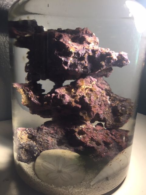 My 24-year-old son is moving into his own apartment and I've been cycling this big jar to be a portable shrimp tank for him. I've got a color-changing LED light in the lid so he can give it some atmosphere when he wants. I'm starting to see algae, and about 25 shrimp from my own tank will be living in there soon. I think they'll enjoy exploring and hiding in all the lava rock holes.