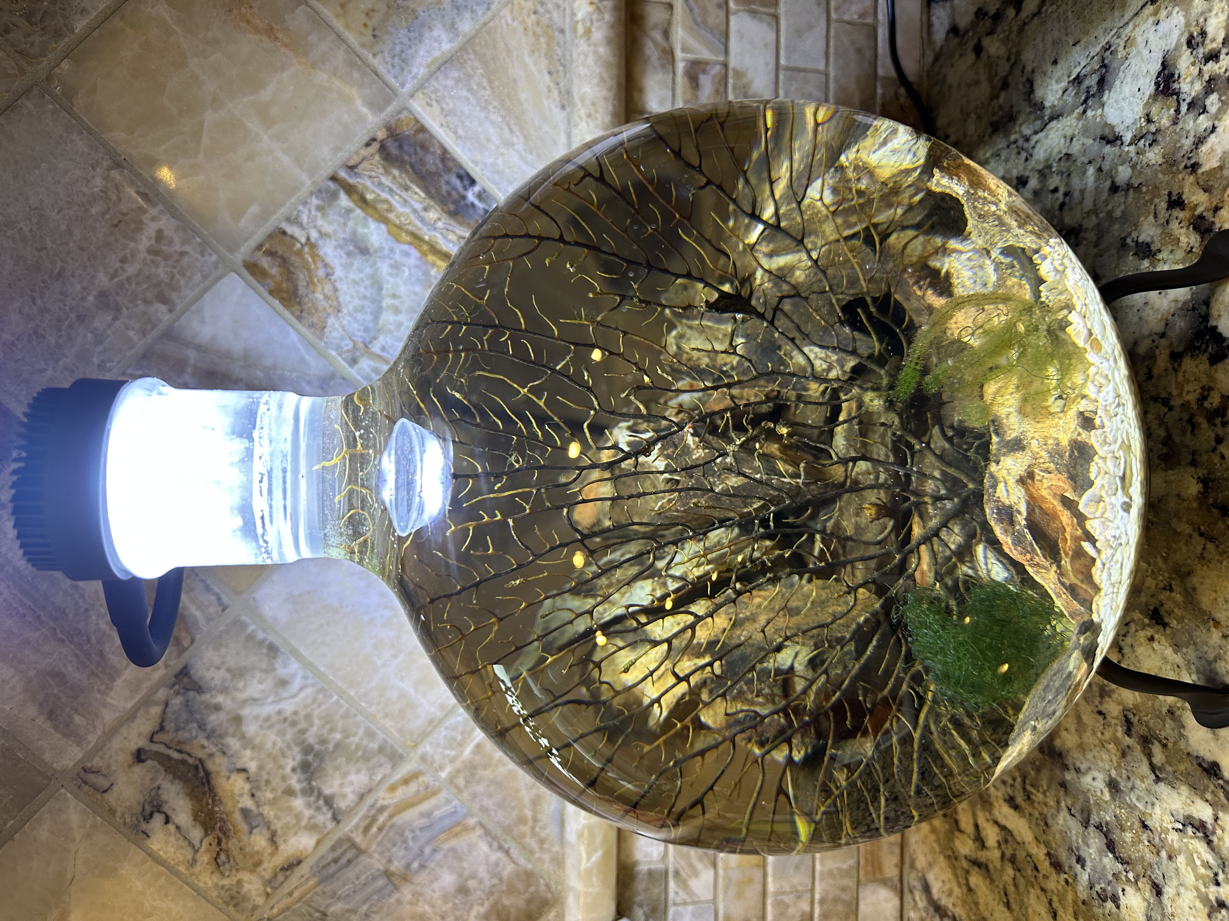 That looks cool! I love sphere tanks. My second tank is a sphere -- 5 gallons, glass. It was originally a beverage dispenser. I'm currently cycling it. It has visible algae and snails, so the shrimp are going in pretty soon.