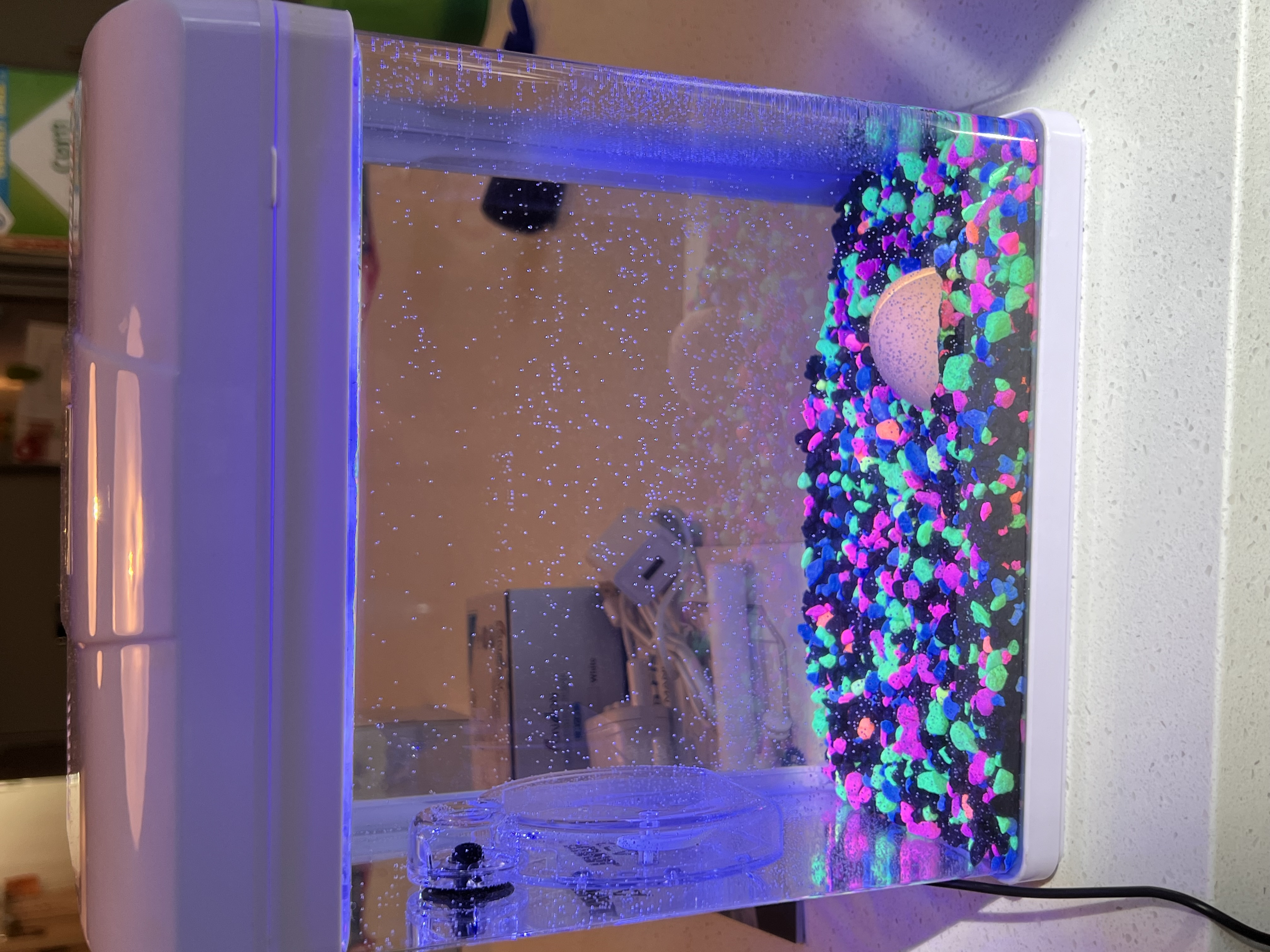 We'll add distilled water as needed to keep the salinity in a good zone until the small tank does cycle. I had no idea how small this shrimp would be! Even the small container it's in now must seem plenty big for it! My son is happy and doting on this little guy!