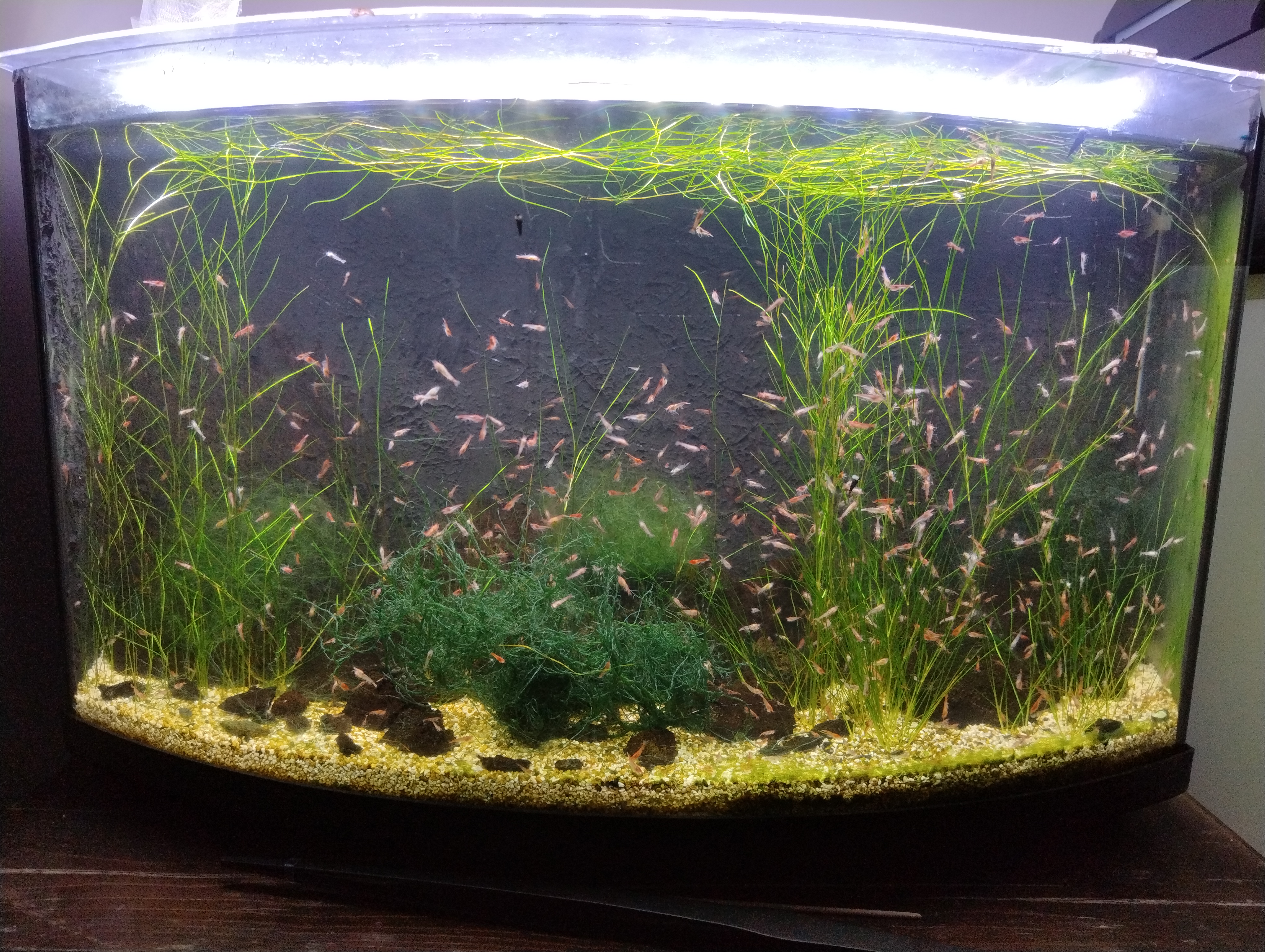 I wonder if the Ruppia is entirely safe for the shrimp over the long term. How often do you change the water? Must you remove dead material frequently? Does the Ruppia display a seasonal die-off or does it grow continually in your tank? How many hours of light per day do you provide?
