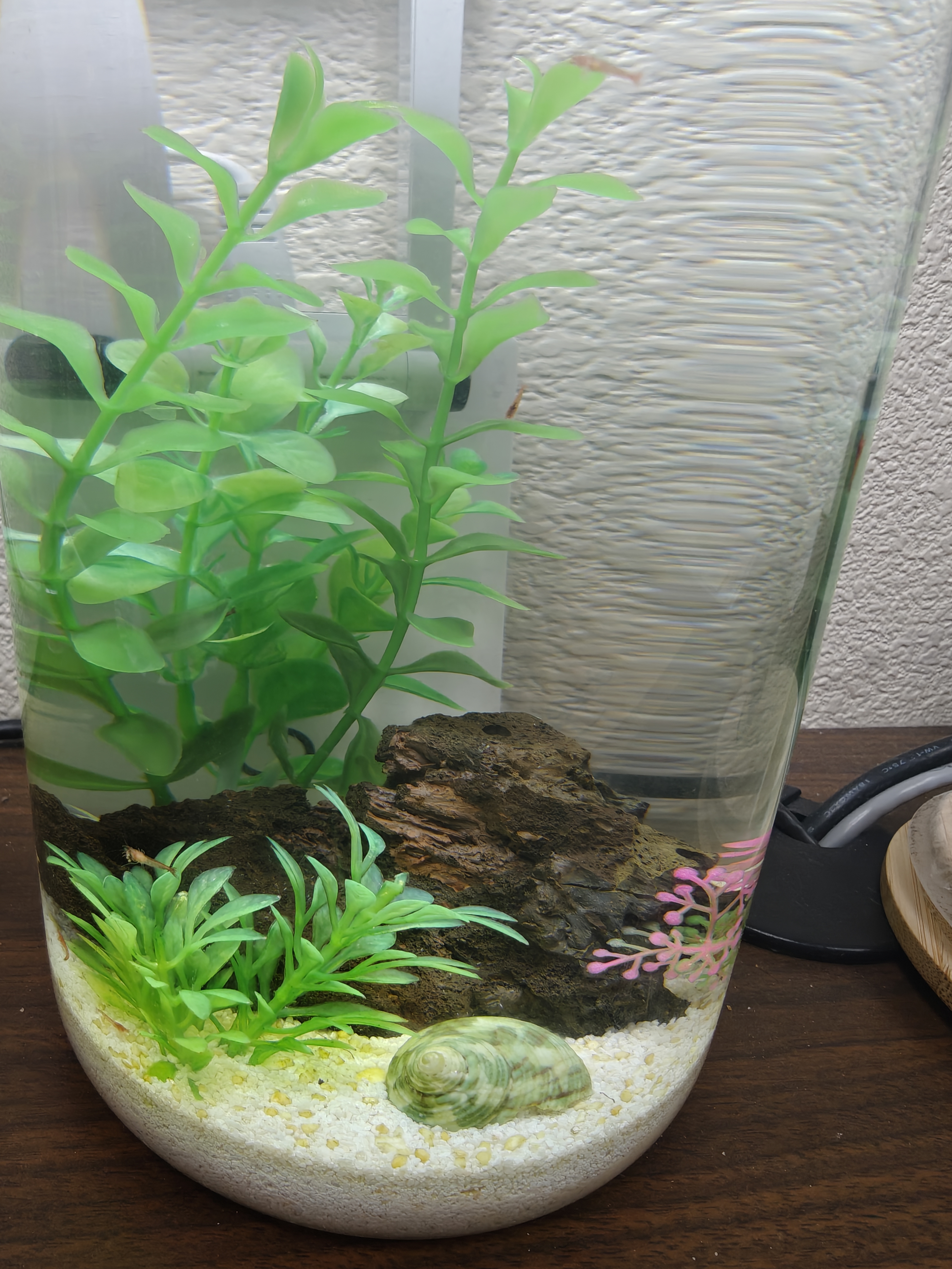 I used plastic aquarium-safe plants, lava rock and some shells - all thoroughly cleaned. I used substrate from the same bag as my other 2 tanks. This tank is about 2 years old now (maybe 3). It's just under a gallon; bigger than my tanks at home. The shrimp are fine, it's just the snails that seem to have problems.