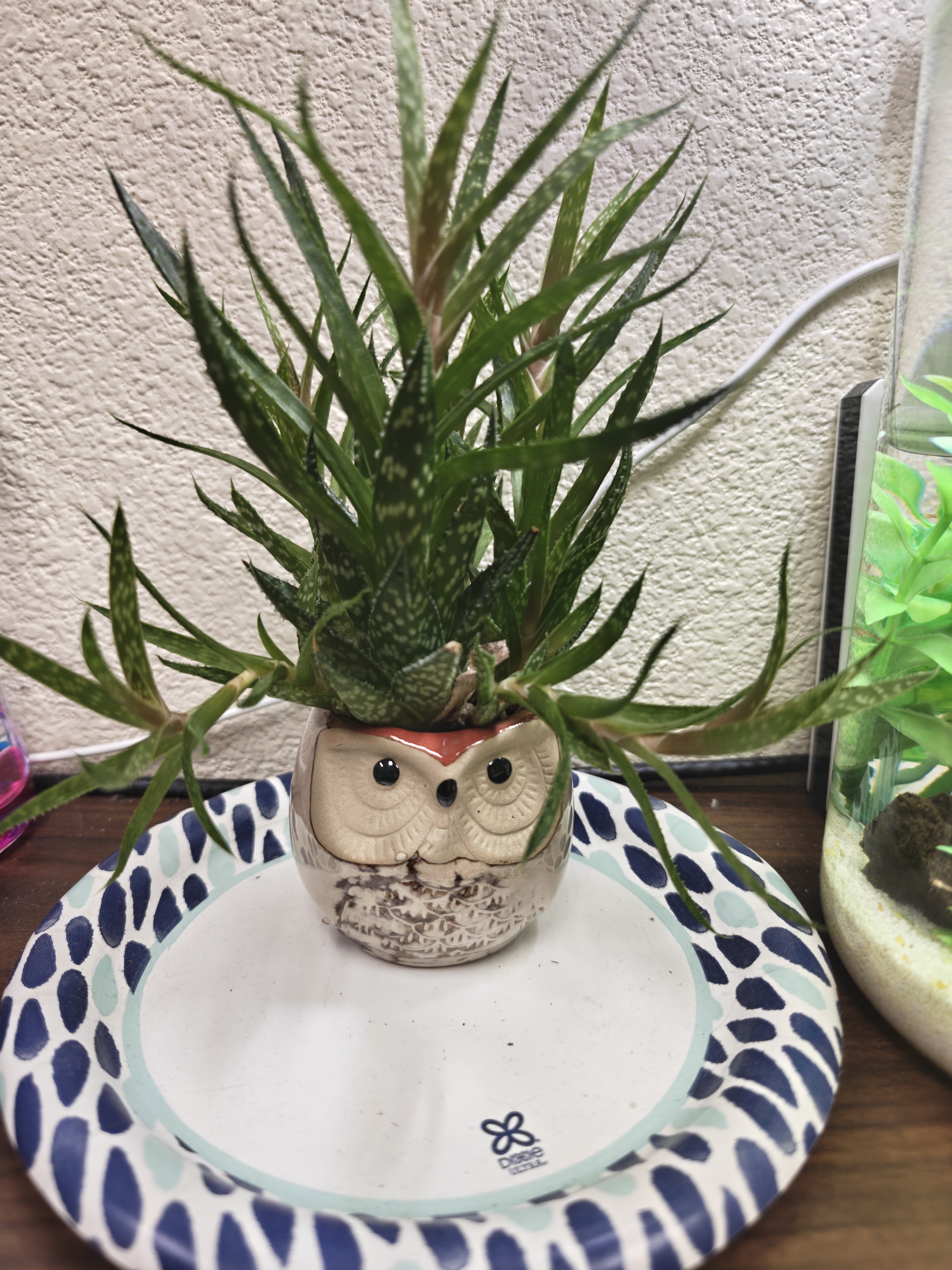 I did end up doing a 1/2 water change a while back just in case something had gotten in I wasn't aware of as this is does sit on my desk at work. But it has a lid that I only take off during my working hours. It close it at night and on weekends. And I use an LED light for algae growth (and apparently my succulent loves it too. It's huge!).