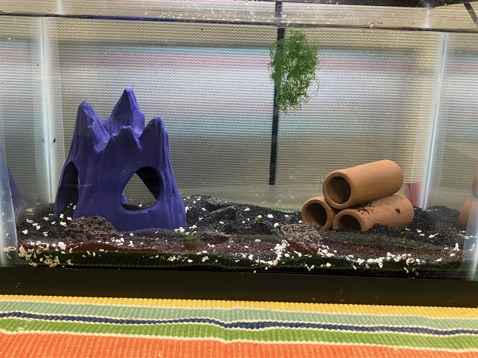 I'm cycling my aquarium and don't have actual shrimp yet. I'm following the instructions that Mustafa gives for setting up my aquarium. 2.5 gallon aquarium. I got lava rocks and black substrate from supershrimp. I got the reef salt and calcium carbonate rocks from supershrimp as well. I have a clump of chaeto and the magic moss ball as well. About day 5 I added my group of 10 snails (I think they're mostly MTS). My tank has been cycling now for about 2.5 weeks.