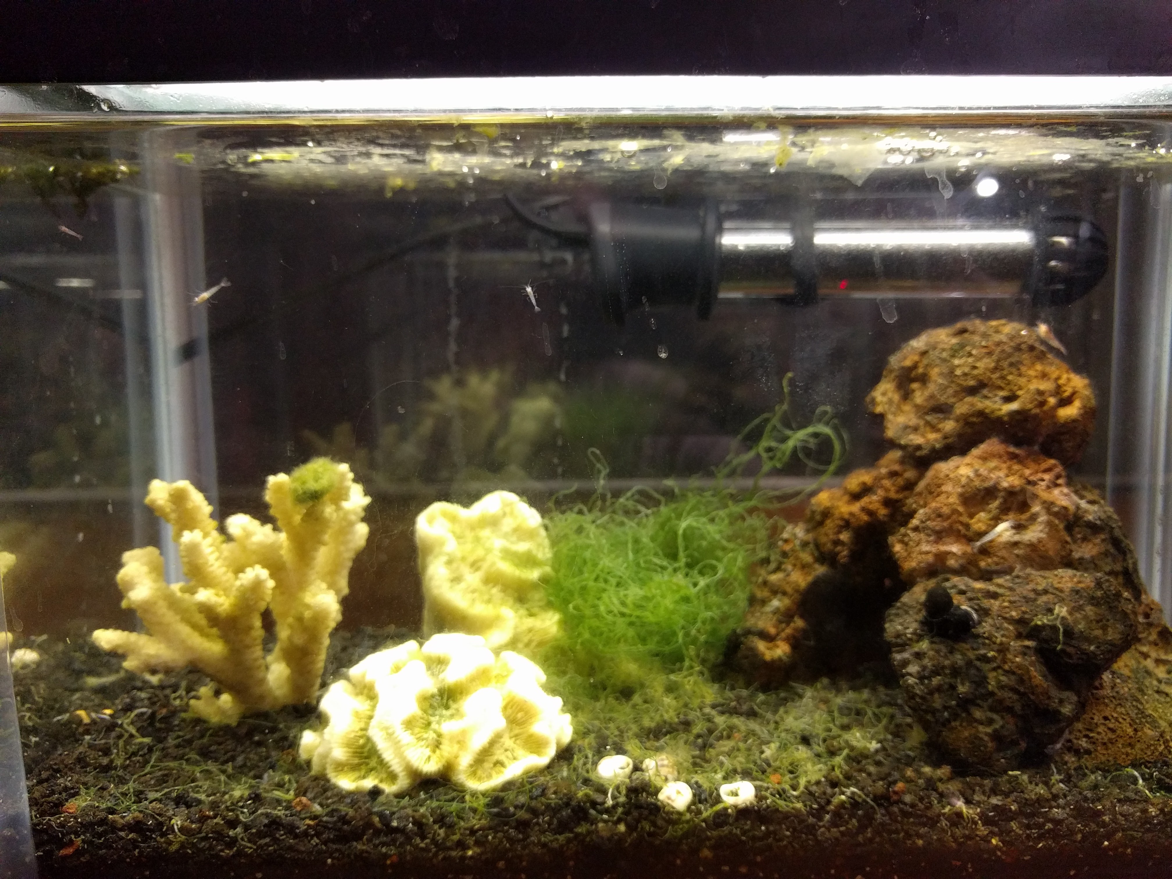 This is my 2.5 gallon. My first tank, it's about 10 months old. It started with ten shrimp, ten trumpet snails, an algae ball and some macro algae. The macro algae in there now is some that I pulled from my crab tank since I had a collapse of macro algae in this tank. The macro algae in the crab tank is from this tank originally though and seems to live better in the other tank. In this pic you can see three generations of shrimp I have hatched on the glass on the right and center. And if you zoom in you can see one of my original purchased shrimp on the lava rock and one on the glass on the right. There are also a couple Zebra Horned Nerites in here and a couple baby trumpet snails. When i saw there were baby trumpet snails in this tank I moved my three mature trumpet snails to the bigger tank and replaced them with a couple Pipipi's to help keep algae down... This is my 5.5 gallon tank where my crabs live. I have 5. There is one in a white moonshell on the coral. You can also see two molted skins from the crabs in the bottom right corner. (I had two crabs molt this weekend