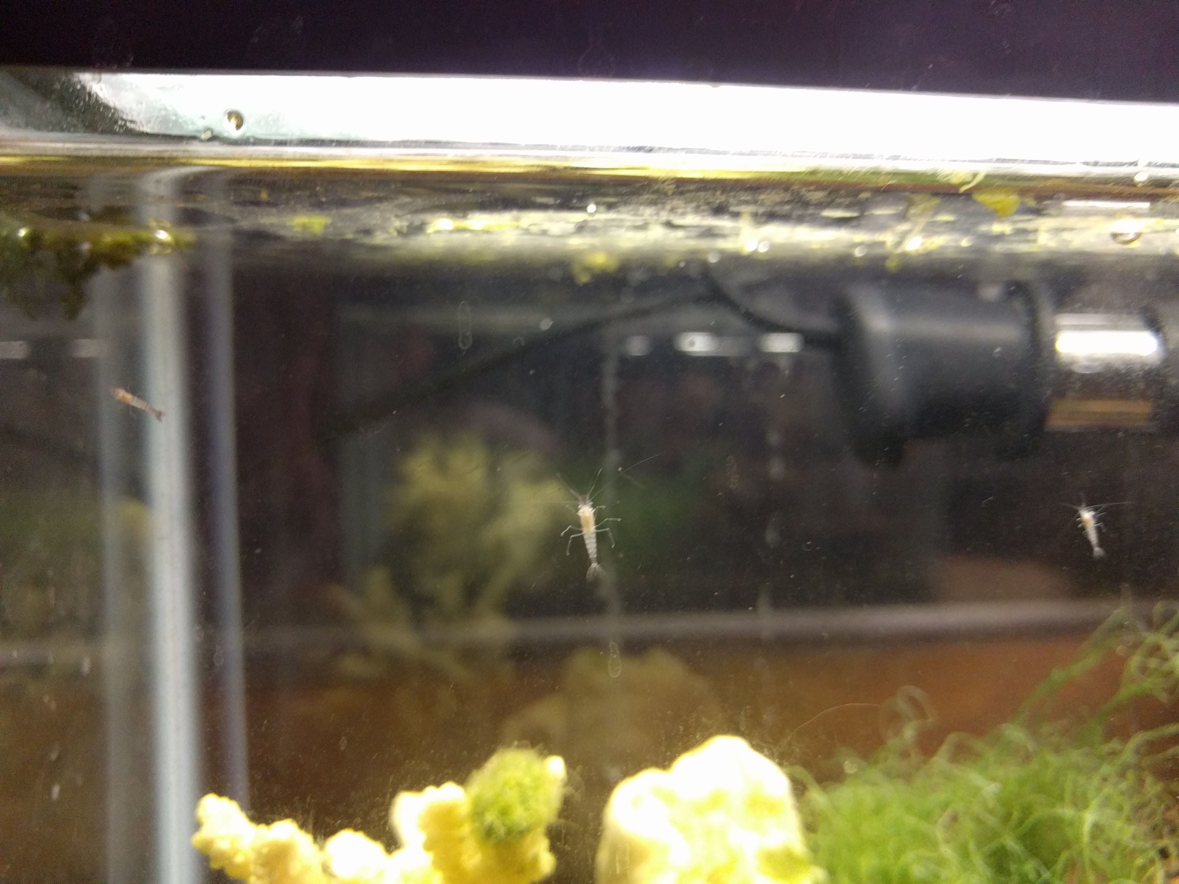 Just wanted to give everyone an update... Despite the dying off of my macro algae and moss ball in my shrimp tank, I now have several (about 10) small additions to my tank. And yesterday after I thought my trumpet snails had all died one emerged from the substrate and then I saw a tiny little snail cruising along my glass... so it seems I have a baby snail in addition to my growing shrimp population....