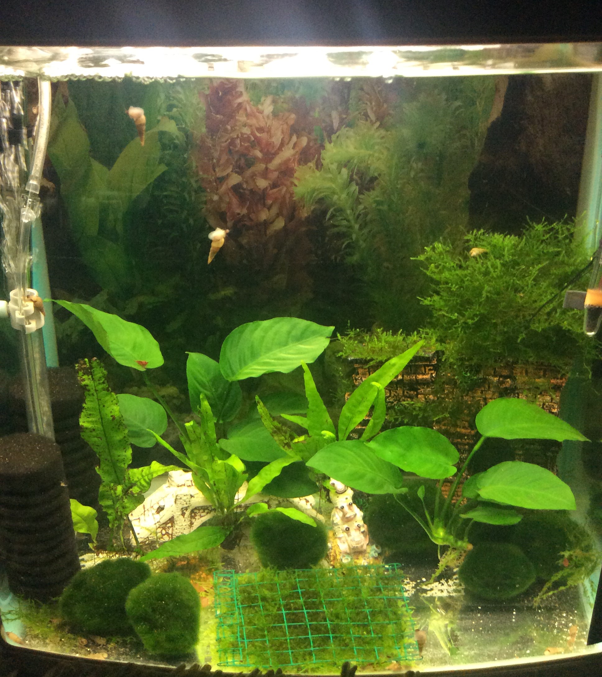 This is my 10 gallon shrimp (and rescued malaysian trumpet snail) tank. Home to 6 cherry shrimp (5 females, one male) and has java and christmas moss (the square at the front middle is where i'm trying to grow a moss carpet), 3 java ferns, 8 moss balls and 2 anubias. It's not very organised at the moment but the shrimp love exploring.