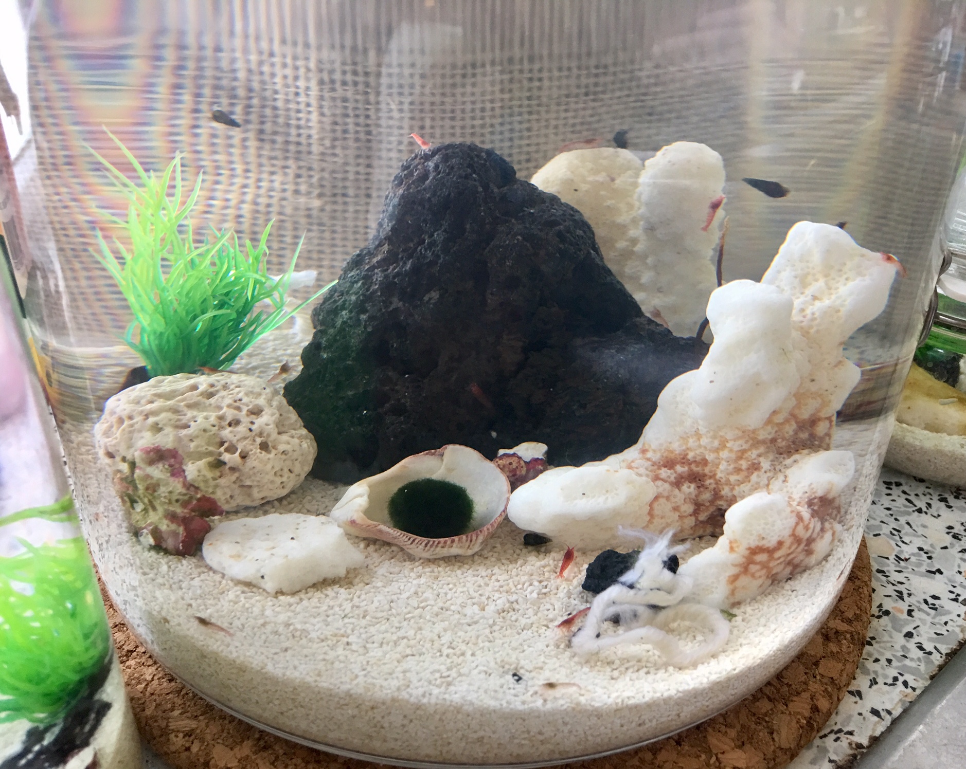 My shrimpies are all looking healthy and happy, and I switched them out of the standby tank I had them in back to the one I had always hoped to keep them in. It is 5 liters. All of the lava rock and corals are finds from when I lived on Oahu.