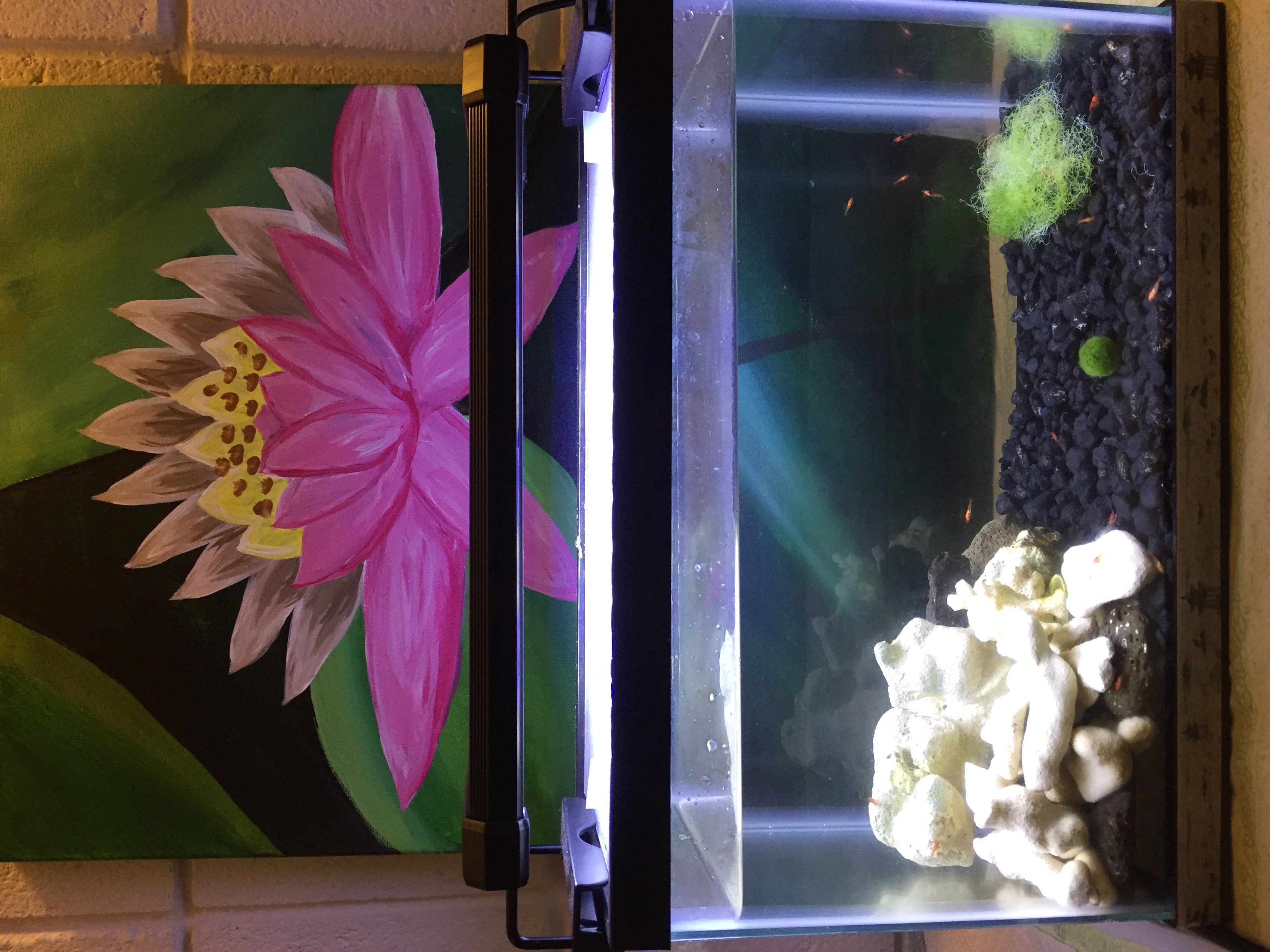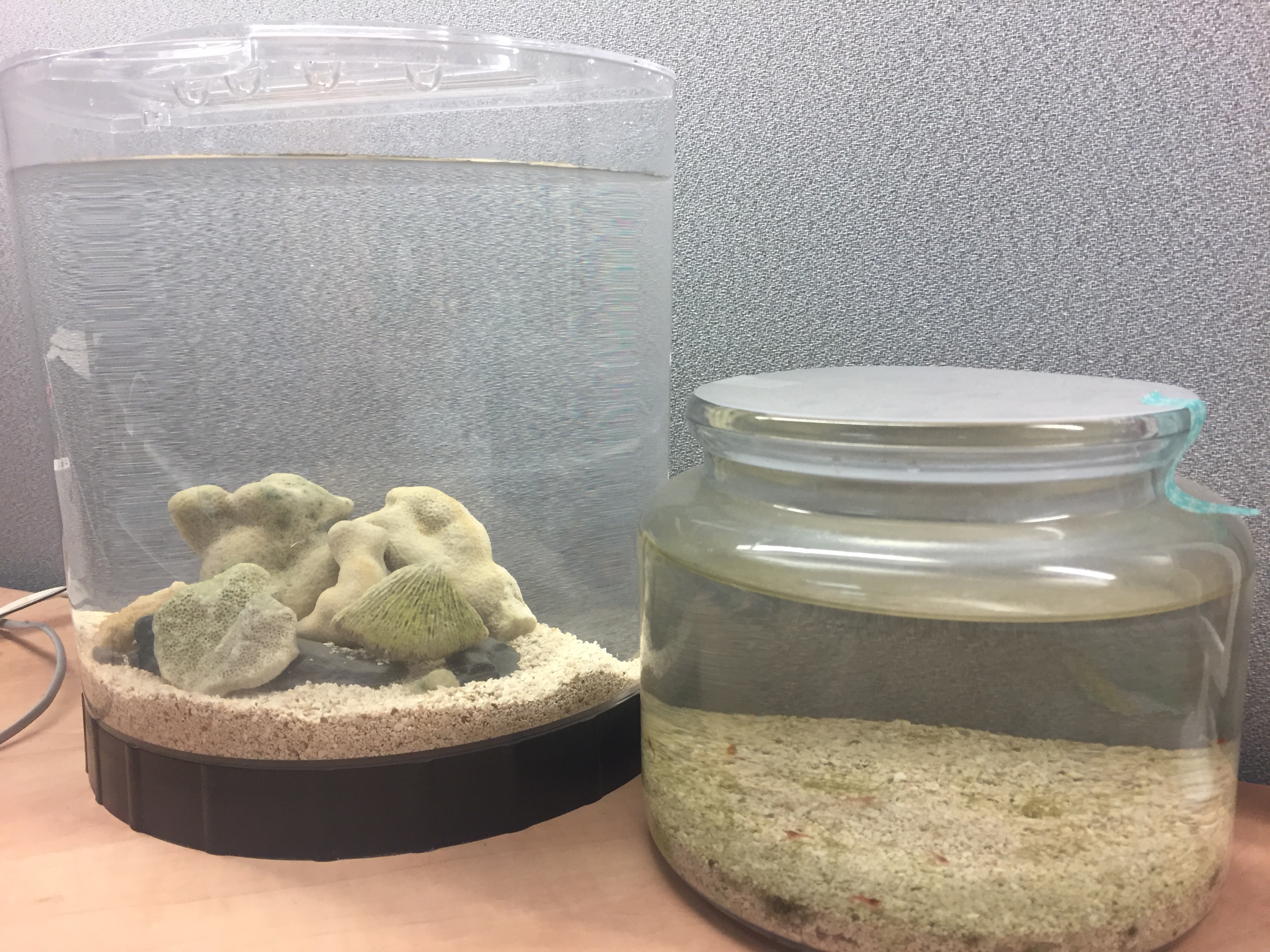 The work tank Is now about 2 months old and seems to be holding steady. There's no light on it and it sits in the dark on weekends. I love having the shrimpies with me at work. They are so fun to watch and are a great stress reliever.