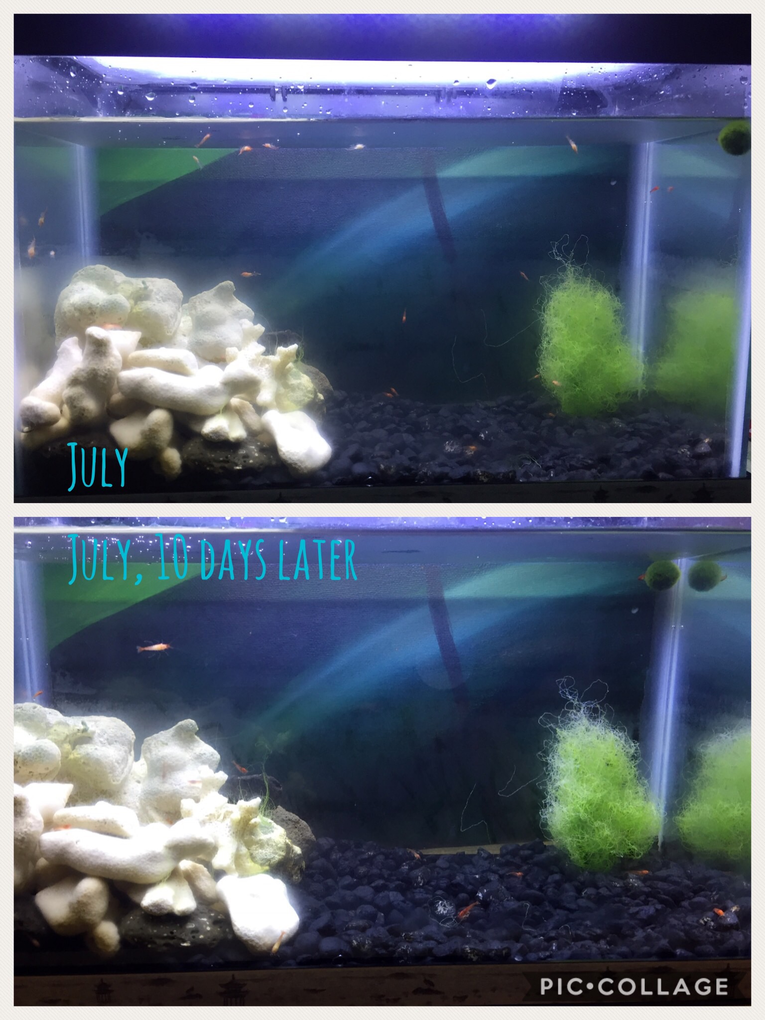 The few strands left are growing and there’s a small clump now. The mossball is still the same. The hair algae came back though. It isn’t growing as fast as when it first showed up so I’ll pull it up and hopefully it will eventually stay away.