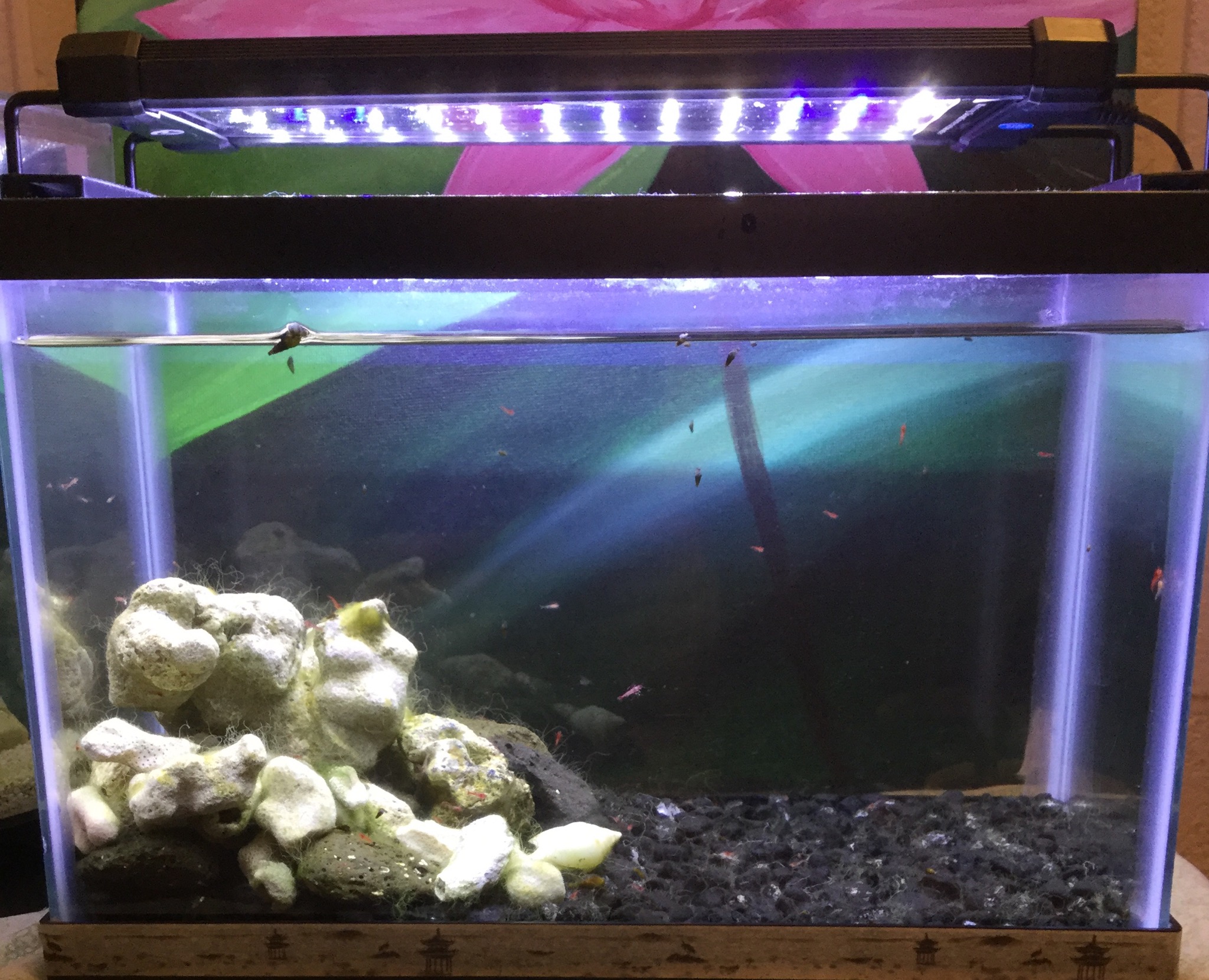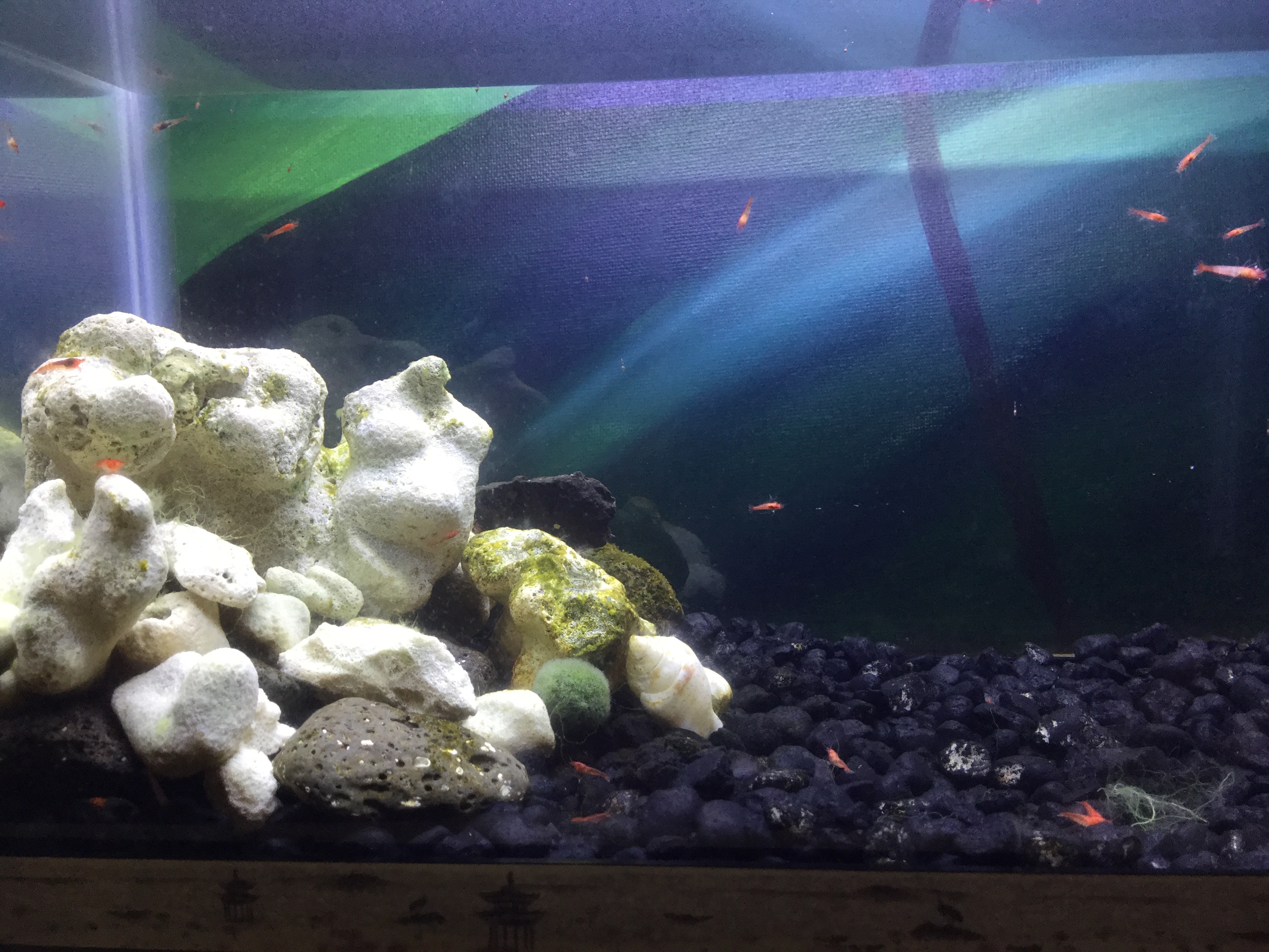 They got upgraded to a 2 gal tank in 2015. There were about a dozen shrimp by that time. I started supplementing in August 2016 with a small flake (lentil size) every week or two. This March, I saw a heavily berried female and then the adorable tiny bobbers.