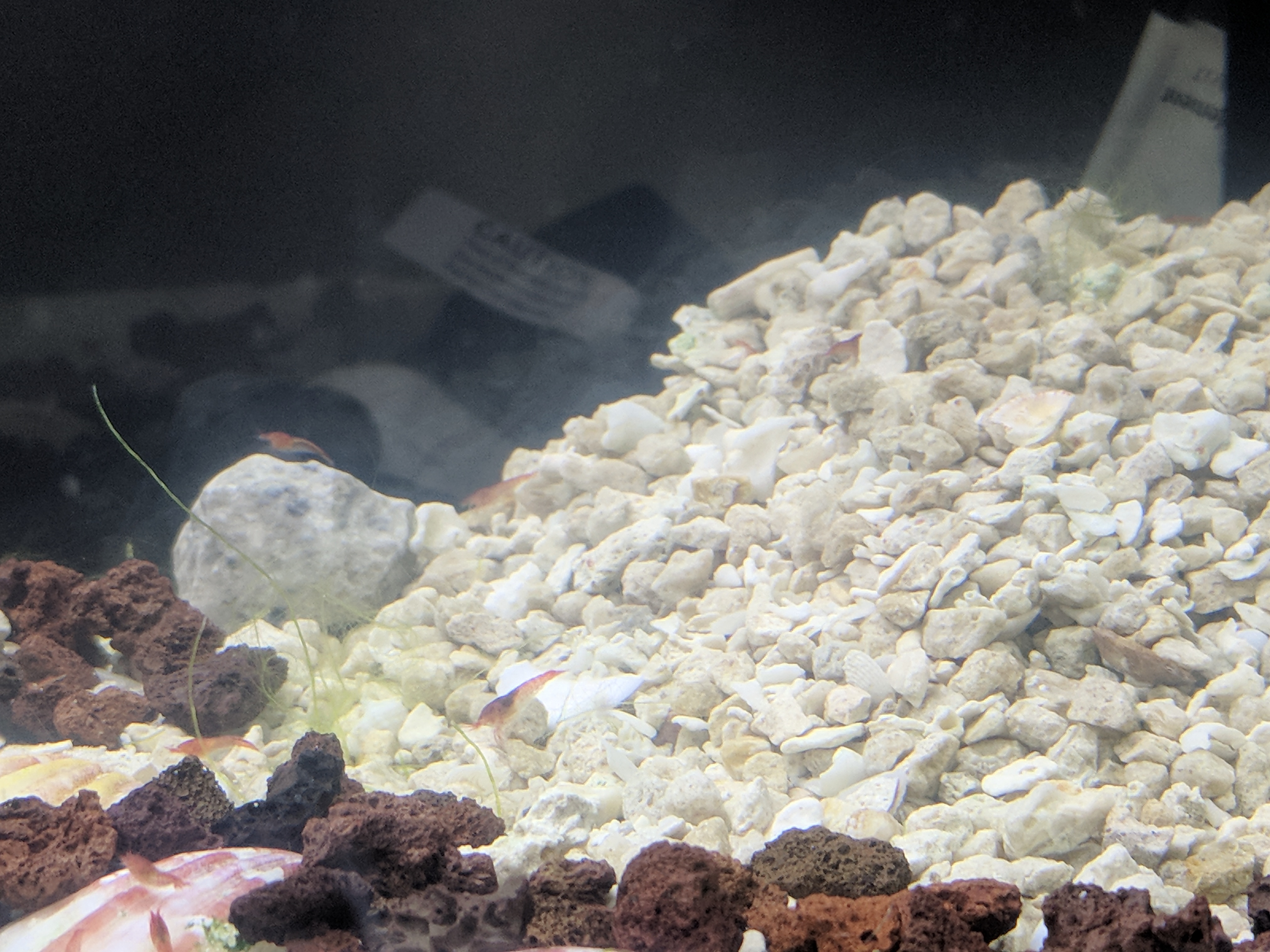 In April, I got a dozen opae, a mossball and macroalgae to add to the tank. I also got a light and timer. After the addition of the light, the tank walls grew a coating of brown algae that peeled off in sheets. The shrimp ate it up. I didn’t feed until all the algae was gone and I would regularly see a bunch of shrimp wandering about grazing. When I feed, it’s a lentil size flake or a single micro pellet every 3-4 weeks. I’ve had some babies each month since March. I don’t clean my tank walls but in July I noticed what I assumed was hair algae growing on a patch of the coral for the first time. Around this same time, the macroalgae which had been growing well, started to show signs of distress. It just went downhill from there. I tried to put together some pictures to show progression, but the mossball color change isn’t showing up well in the photos. I really don’t want to lose my moss ball. I have dreams of a lush green carpet of mossballs.