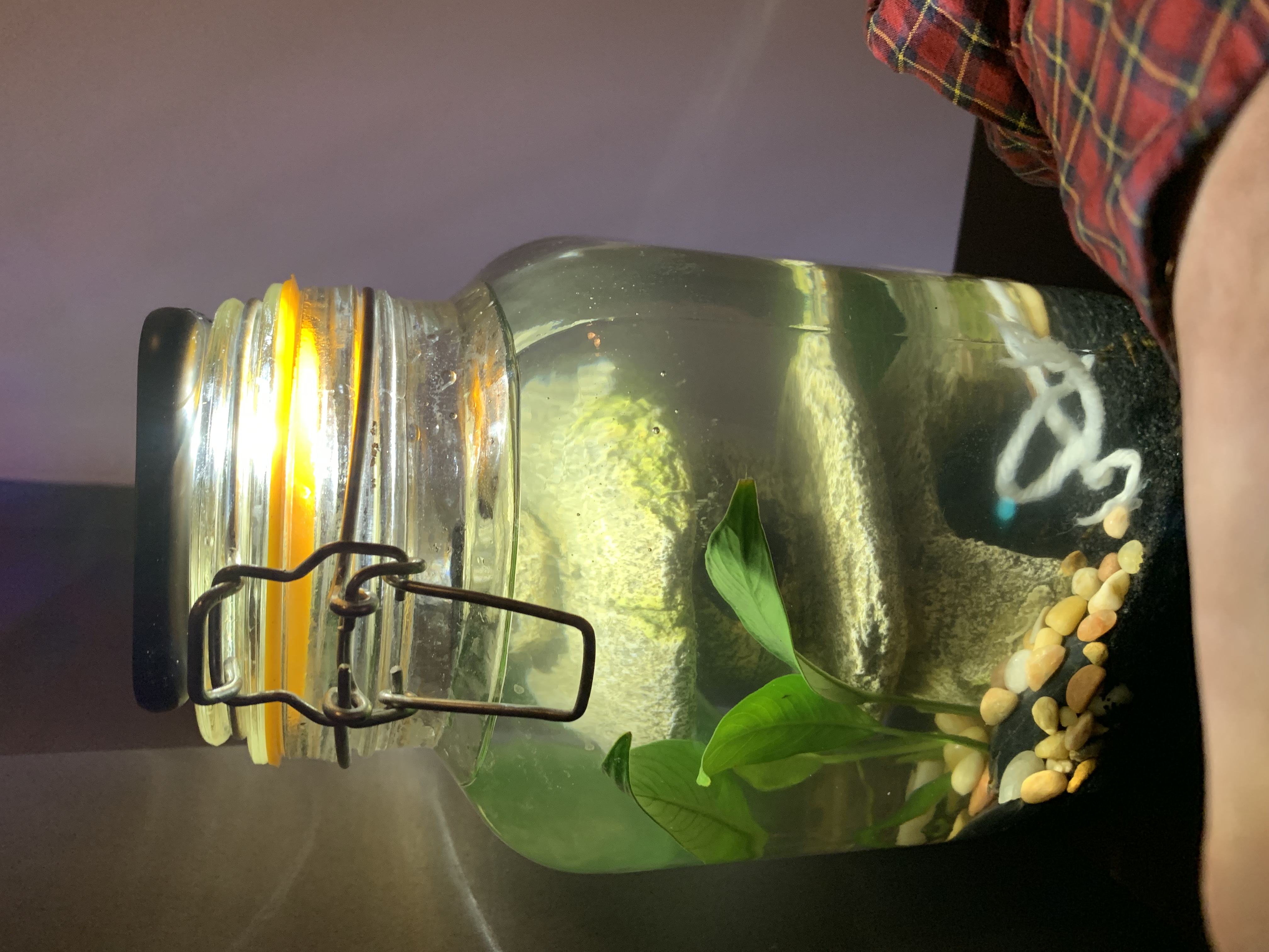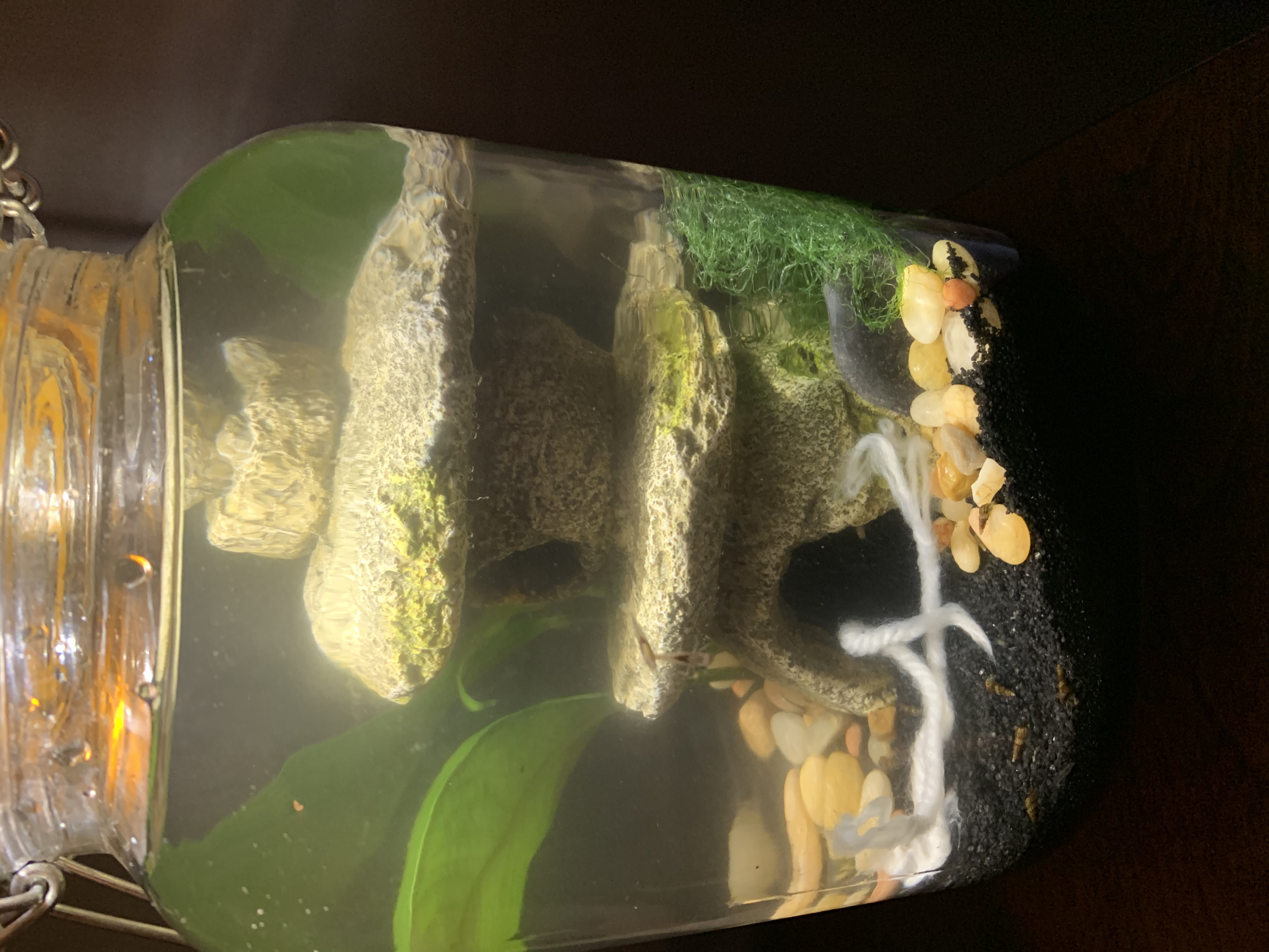 I went and bought a small decoration for the shrimp to hide. I put a small Anubias Congensis as I heard they are hardy and good for brackish.. Have a feeling if it actually survives, it’s going to get big but my thought was maybe I could clip it back? Regretting I didn’t put them in a gallon +....I can remove it if anyone thinks it’s gonna cause ammonia problems...