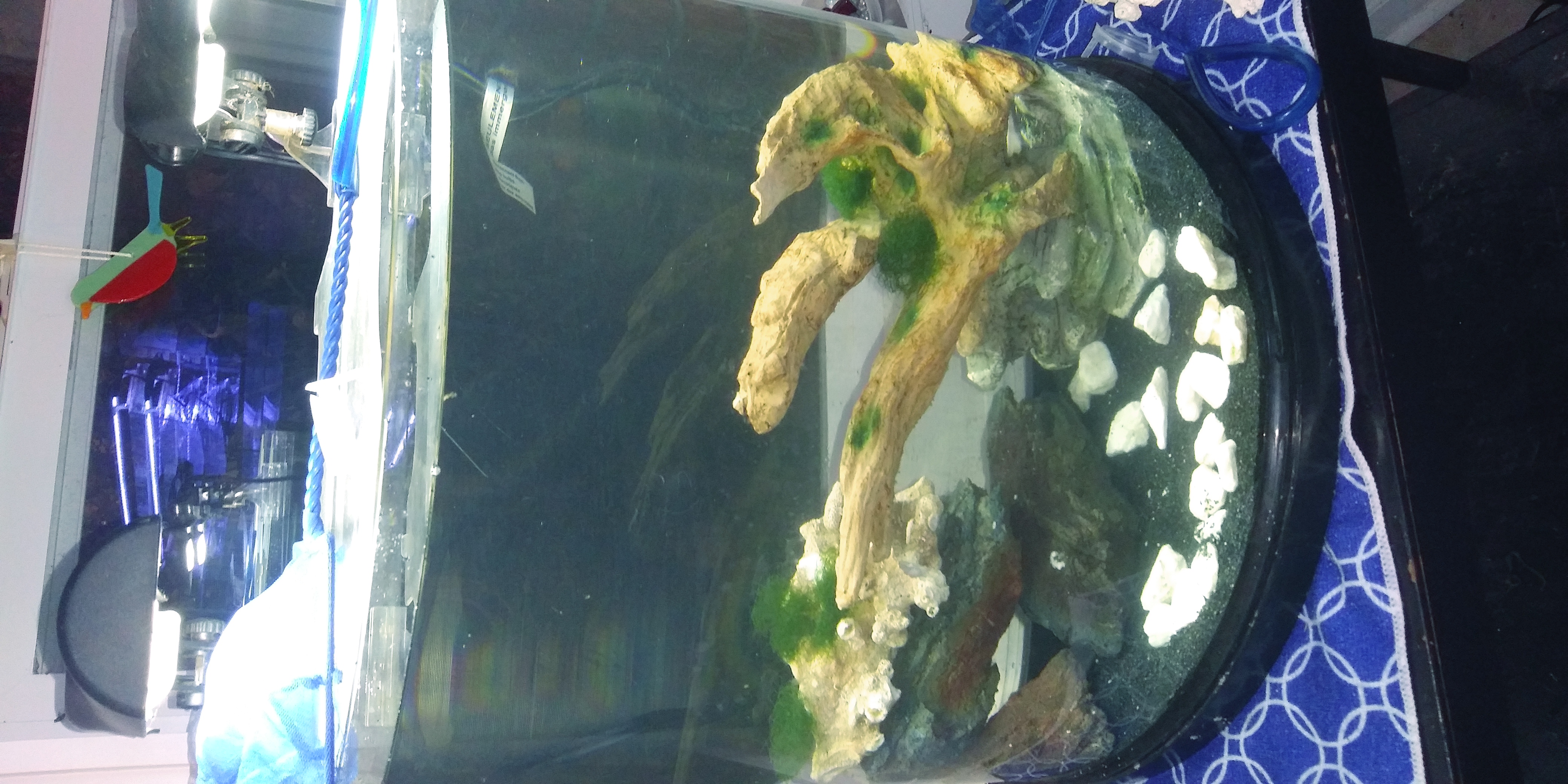 I added a mangrove tree. It was sitting in my dwarf seahorse tank and looking a little droopy. I thought the half salinity in the shrimp tank would help and it's perked up. It should be fine in the shrimp tank right? Mangrove trees grow in any salinity or completely fresh. There is already some algae growing on the calcium rocks. The mangrove should help with aging the tank and I know copepods and shrimp love them. I thought about adding some brackish water copepods, cyclops, they eat detritus. I think I will have to add a small heater. All my tanks are in the sunroom which is quite cold now winter is setting in. Still planning on waiting until after the 1st of the new year to get in the snails and shrimp.