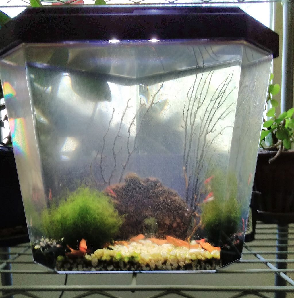 Anyway I let it sit with the light cycle and its about 3 feet from a window so it gets good indirect light. I leave the cap on 95% of the time. A few weeks ago I found a few snails had not moved in a few days, and so I removed them. Anyway I got my shrimp yesterday, on my birthday actually, and so I siphoned some water out so I could add the 12 shrimp I ordered. They seemed to be find and swimming around, playing in the dried coral fan. I came to check on them late this morning and after about 20 or so hours all of the shrimp have died :(