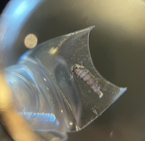 In the picture it's on half of a plastic straw, so very small... I'm pretty satisfied that it was an invader and not shrimp-related so not too worried about IDing it anymore, but would still be interesting if anyone happened to know.