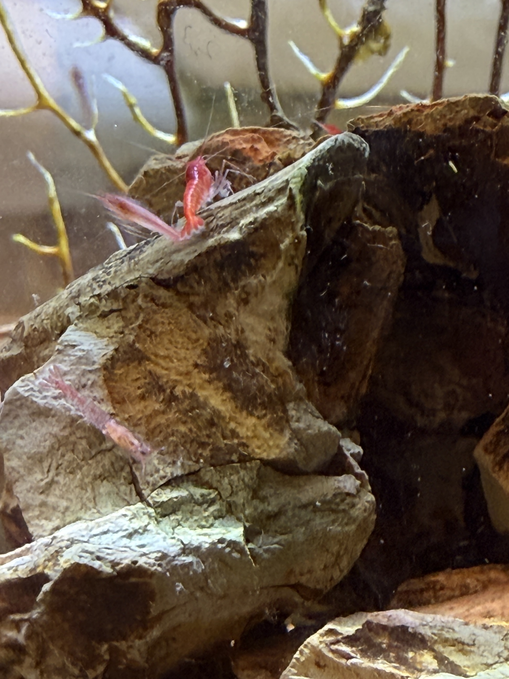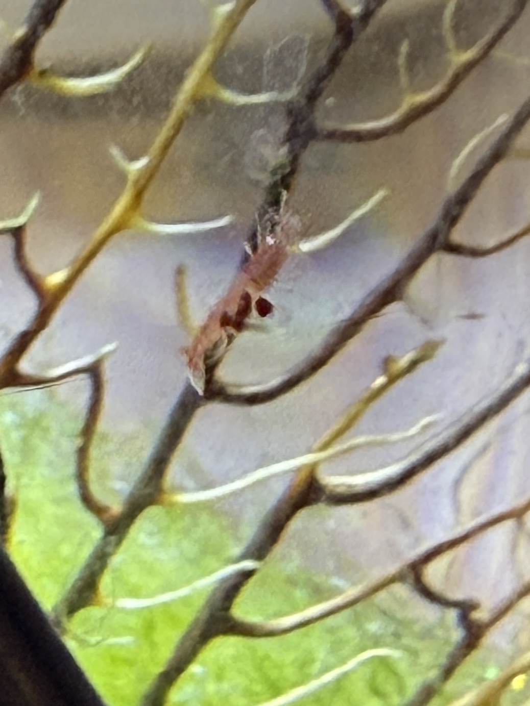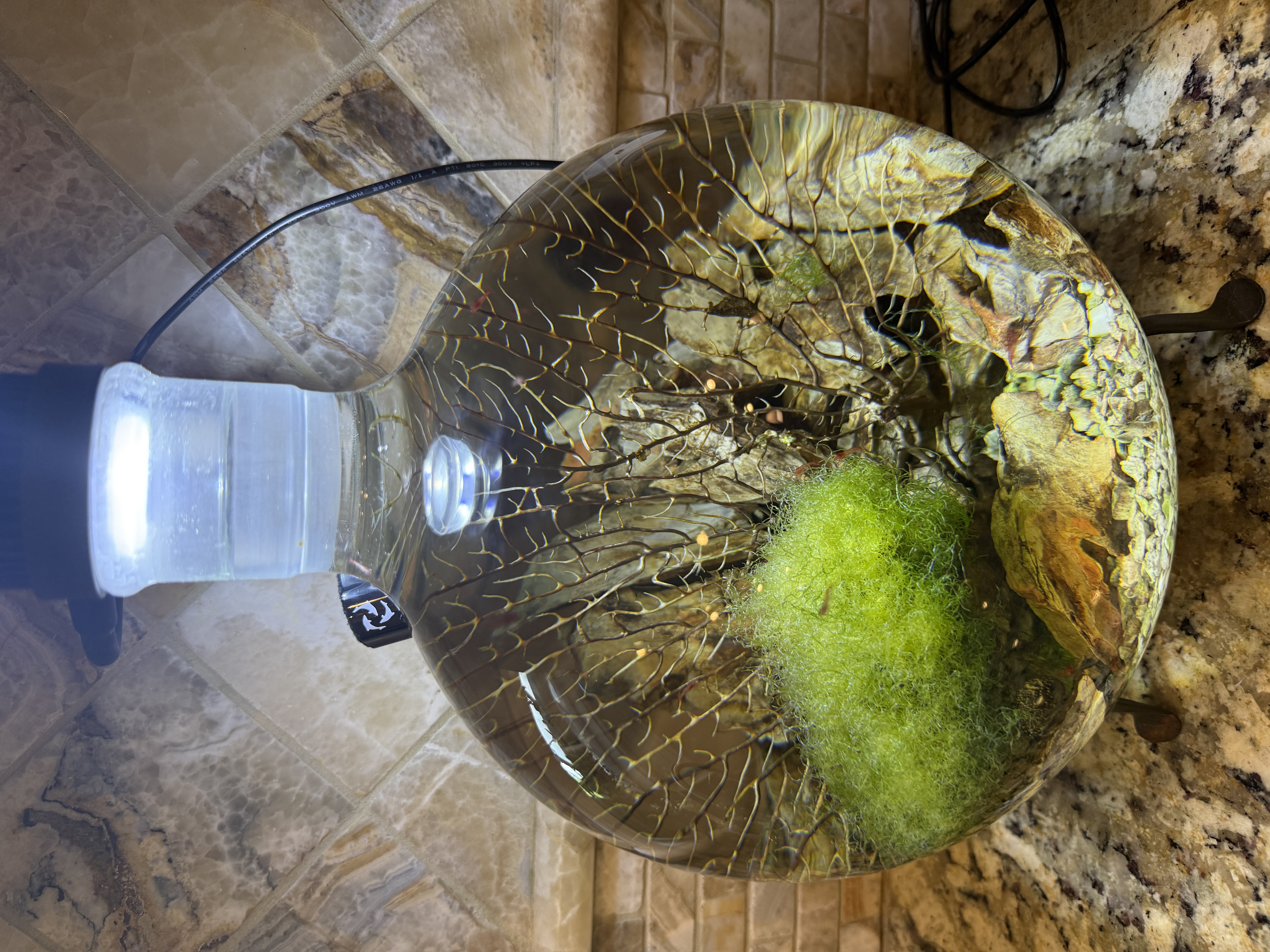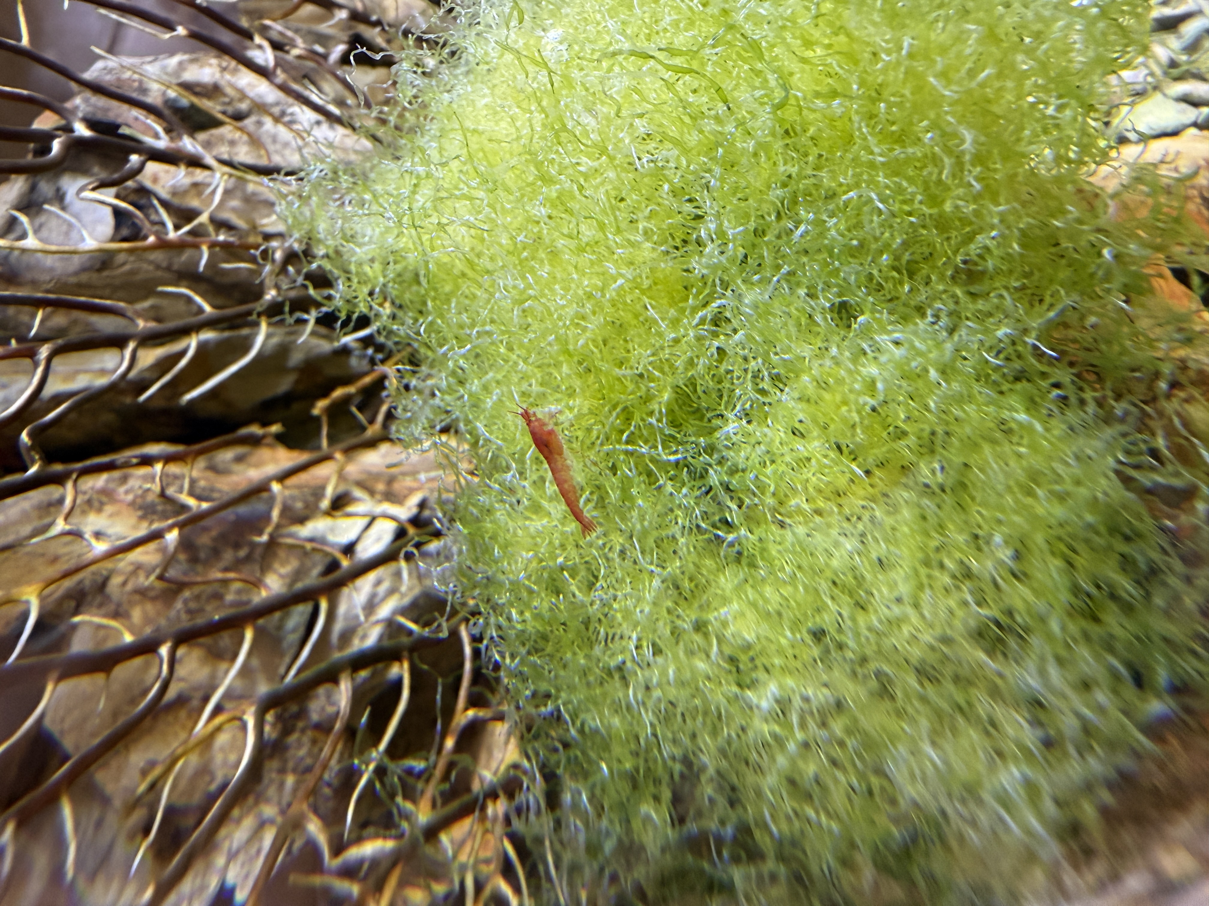 I wanted to share the smallest Opae tank that I’ve set up, which uses a diminutive lab reactor (5000ml / ~1.3 gallon). It’s been running for about three years and I originally established the ecosystem using water, algae, snails, amphipods, copepods and larval-stage Opae Ula from my other tanks, so it’s 100% homegrown. The population has bred a couple of generations of new Opae since it was set up, and I just noticed a new berried female so more babies are on the way!