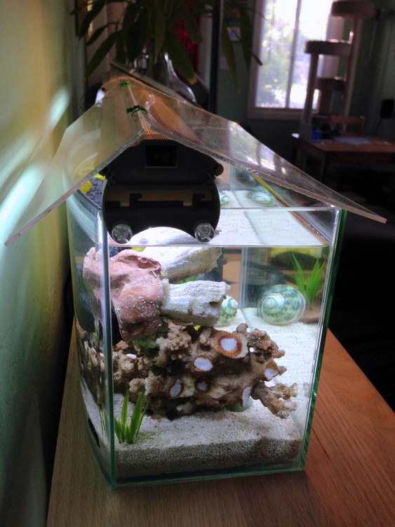 Here it is after implementing Petshrimp's macroalgae. Coincidentally, the landscaping provided a perfect little elevated nook for it...