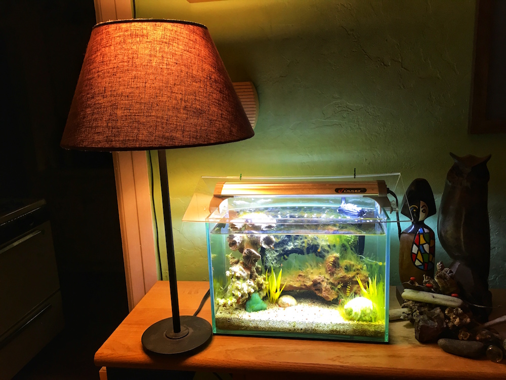 Same thing with that desk lamp sitting next to the tank. I read somewhere (recall that there were photos included as well displaying the effect) that algae tends to respond to warmer color temperatures, and so, I wanted to experiment with that as well. The Finnex aquarium light has a color temp of 7000k which would be considered "cool", more of a mid-day brightness. The LED bulb in the lamp has a "warm" temp of 2700k, resembling sunrise or sunset. I also wanted to see if including the 2700k light together with the 7000k light would have any effect on that plant flourishing in there. Also thought that adding a sunset-resembling warm color temp to the mid-day-resembling cool color temp may have a positive effect on the shrimp (no way of knowing if that's the case - just a thought).
