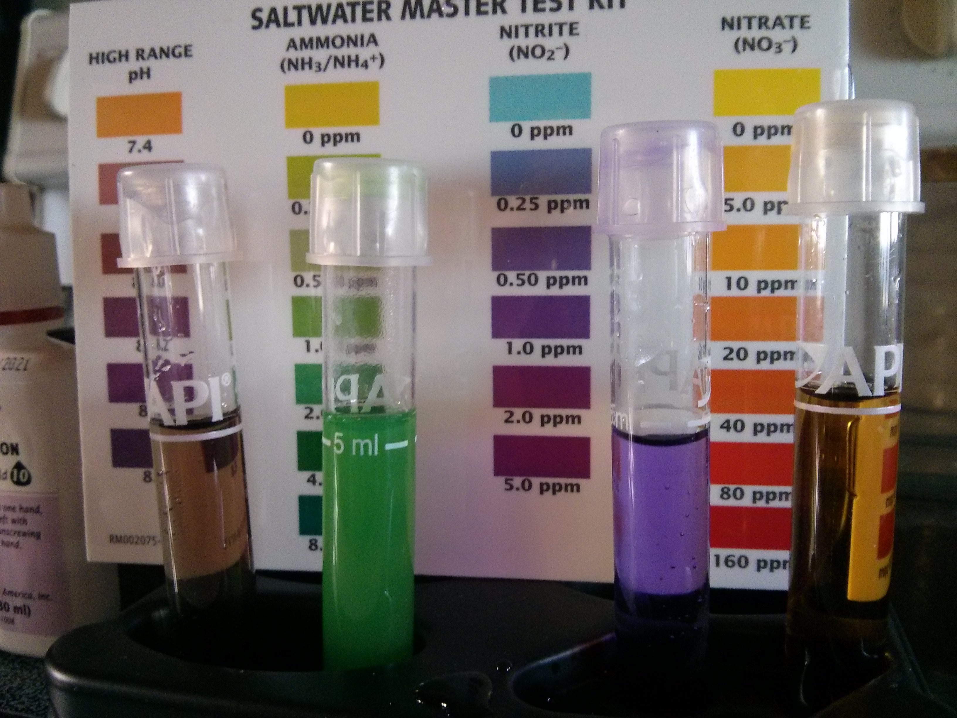 The new tank is definitely cranking away. The Ammonia is slowly dropping and the Nitrates are starting to go up. The Nitrite is about the same as it was a couple days ago. I'm seeing a huge algae bloom on the stuff in there too.
