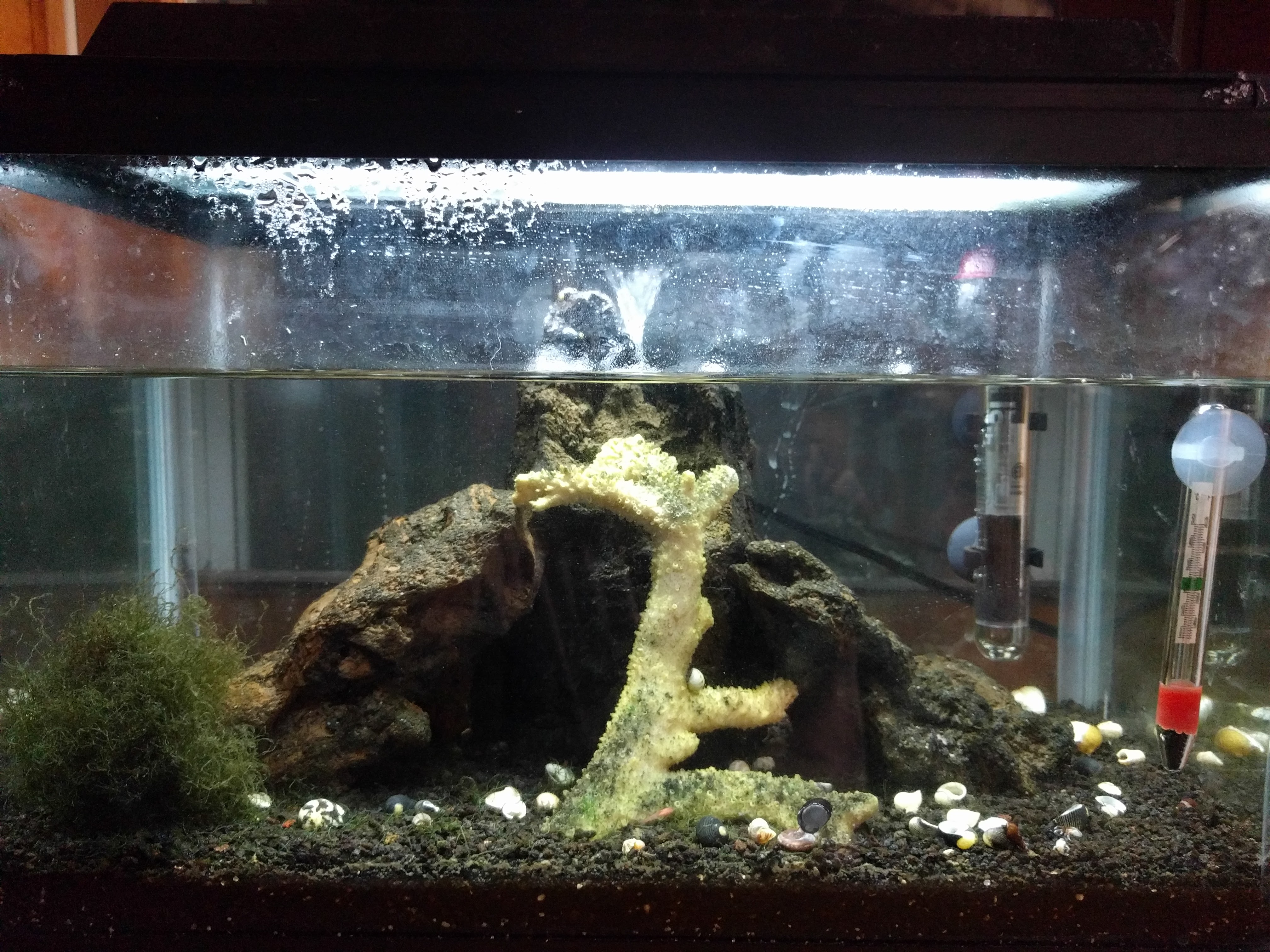 This is my 2.5 gallon. My first tank, it's about 10 months old. It started with ten shrimp, ten trumpet snails, an algae ball and some macro algae. The macro algae in there now is some that I pulled from my crab tank since I had a collapse of macro algae in this tank. The macro algae in the crab tank is from this tank originally though and seems to live better in the other tank. In this pic you can see three generations of shrimp I have hatched on the glass on the right and center. And if you zoom in you can see one of my original purchased shrimp on the lava rock and one on the glass on the right. There are also a couple Zebra Horned Nerites in here and a couple baby trumpet snails. When i saw there were baby trumpet snails in this tank I moved my three mature trumpet snails to the bigger tank and replaced them with a couple Pipipi's to help keep algae down... This is my 5.5 gallon tank where my crabs live. I have 5. There is one in a white moonshell on the coral. You can also see two molted skins from the crabs in the bottom right corner. (I had two crabs molt this weekend