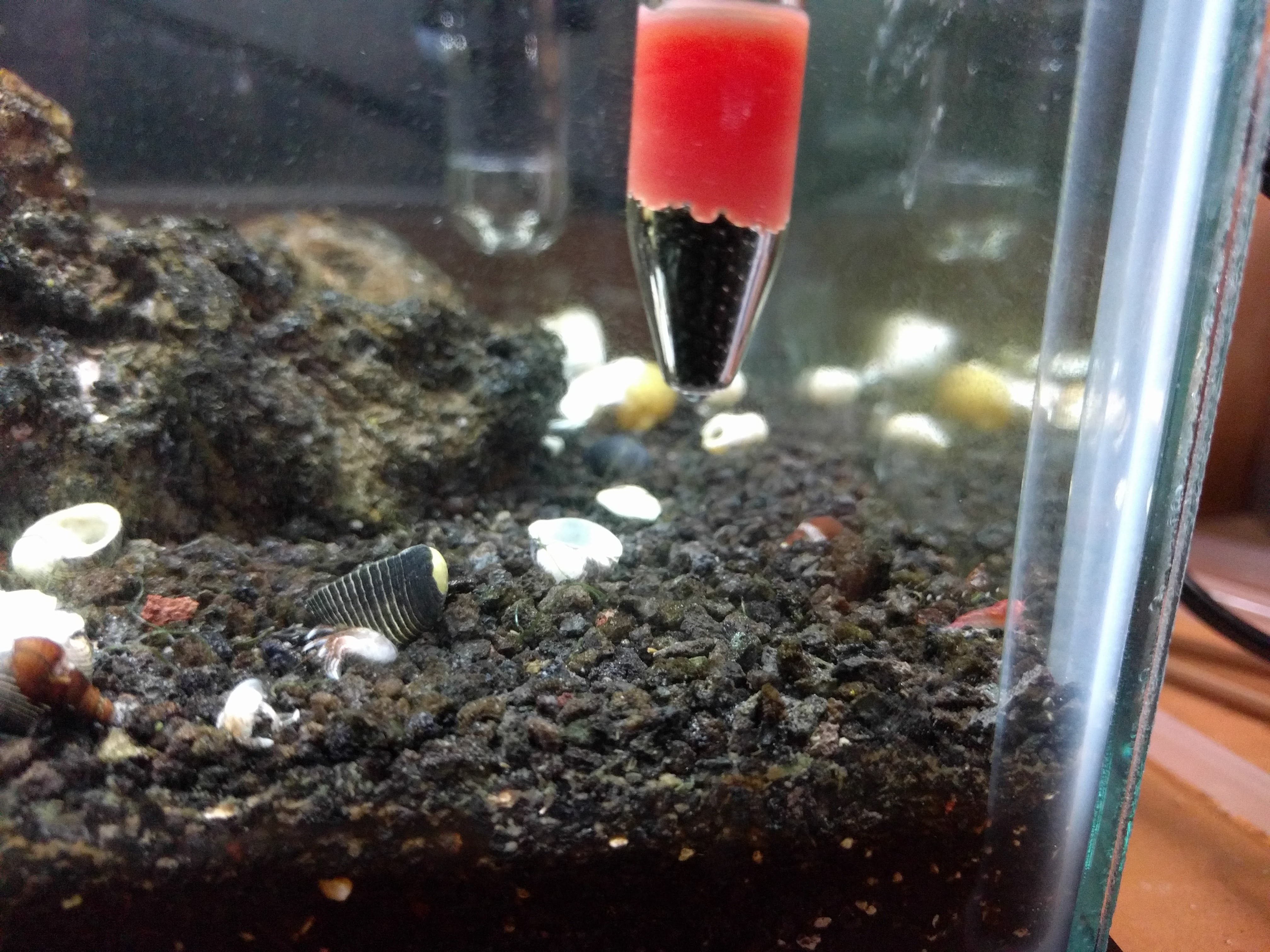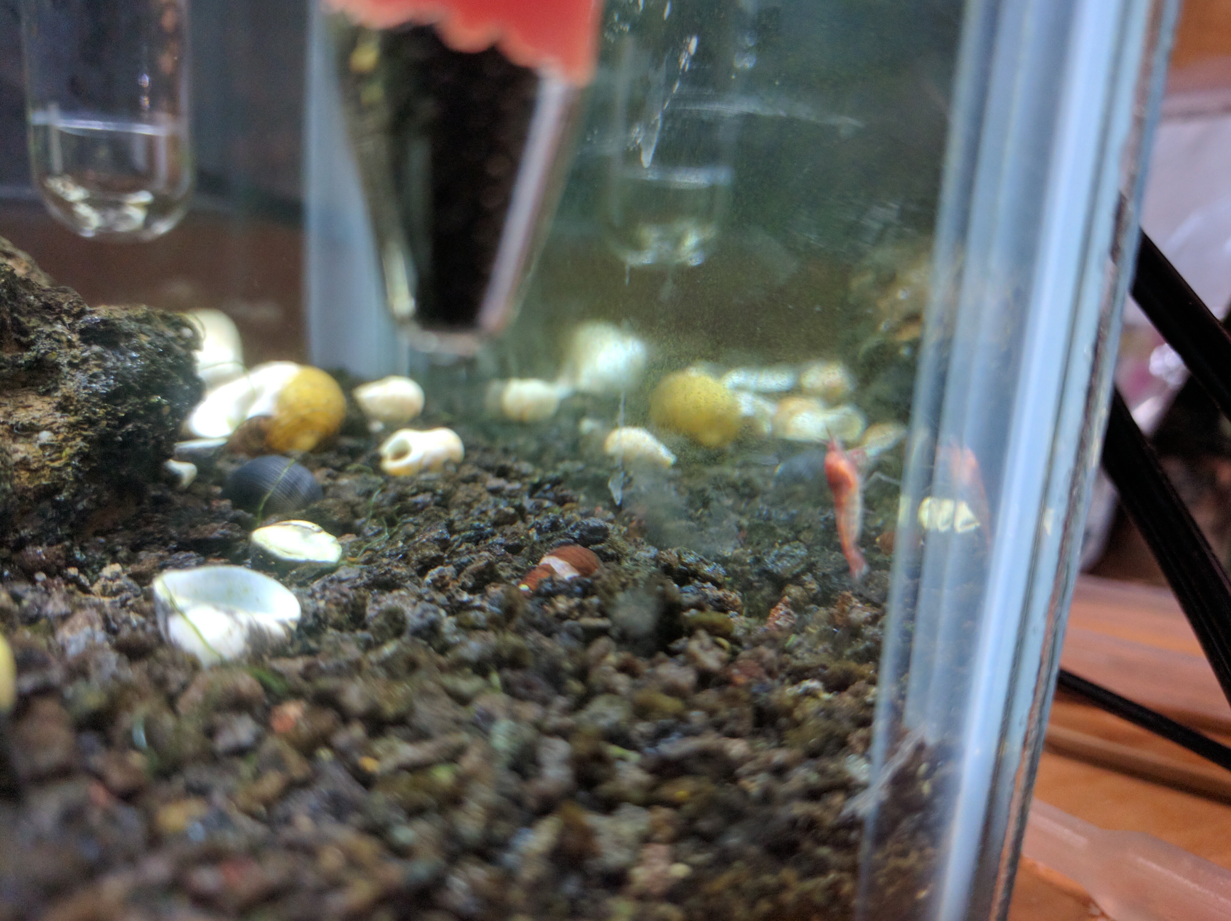 )There are also about 6 Pipipi Nerites in here. They are most active at night. I also moved one of my Zebra Horned Nerites in here. They are more active during the day and way more voracious than the Pipipi's. And I added about ten shrimp, three of my original purchased shrimp and the rest are all my spawn. There's one in this pic if you can spot him