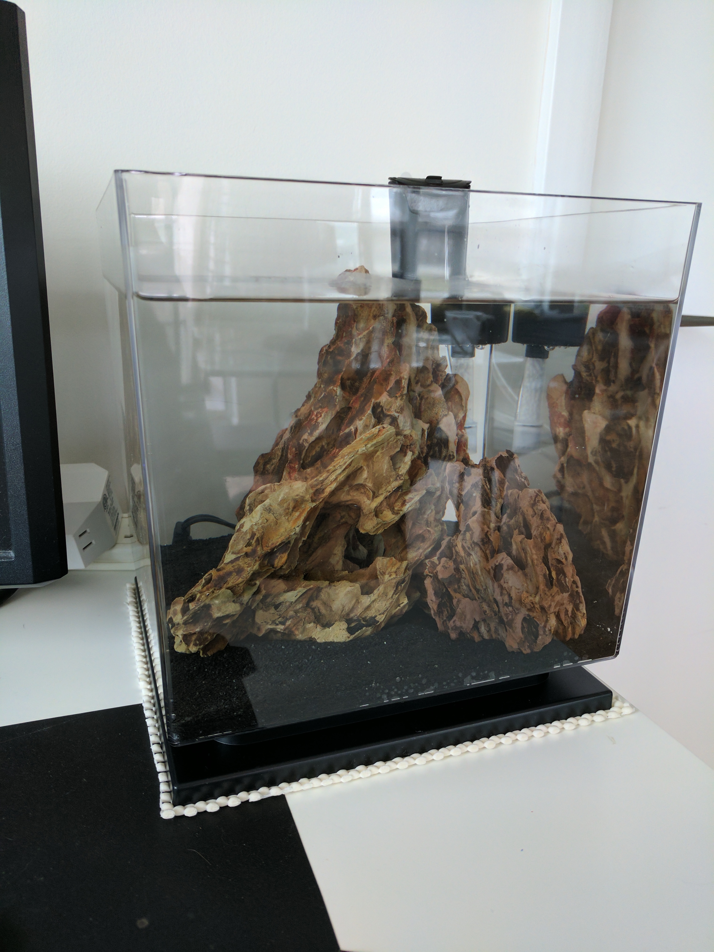 Is this going to be your side or main view? Just thought it looks narrow from this point of view but it has good depth between foreground and background for sure. There are a lot of hiding spaces behind those rocks though which your shrimps may hang around, preventing you from seeing them even though they are not hiding intentionally. So you may consider sloping the substrate level as well to force them into view if you want. Have fun putting in the substrate.