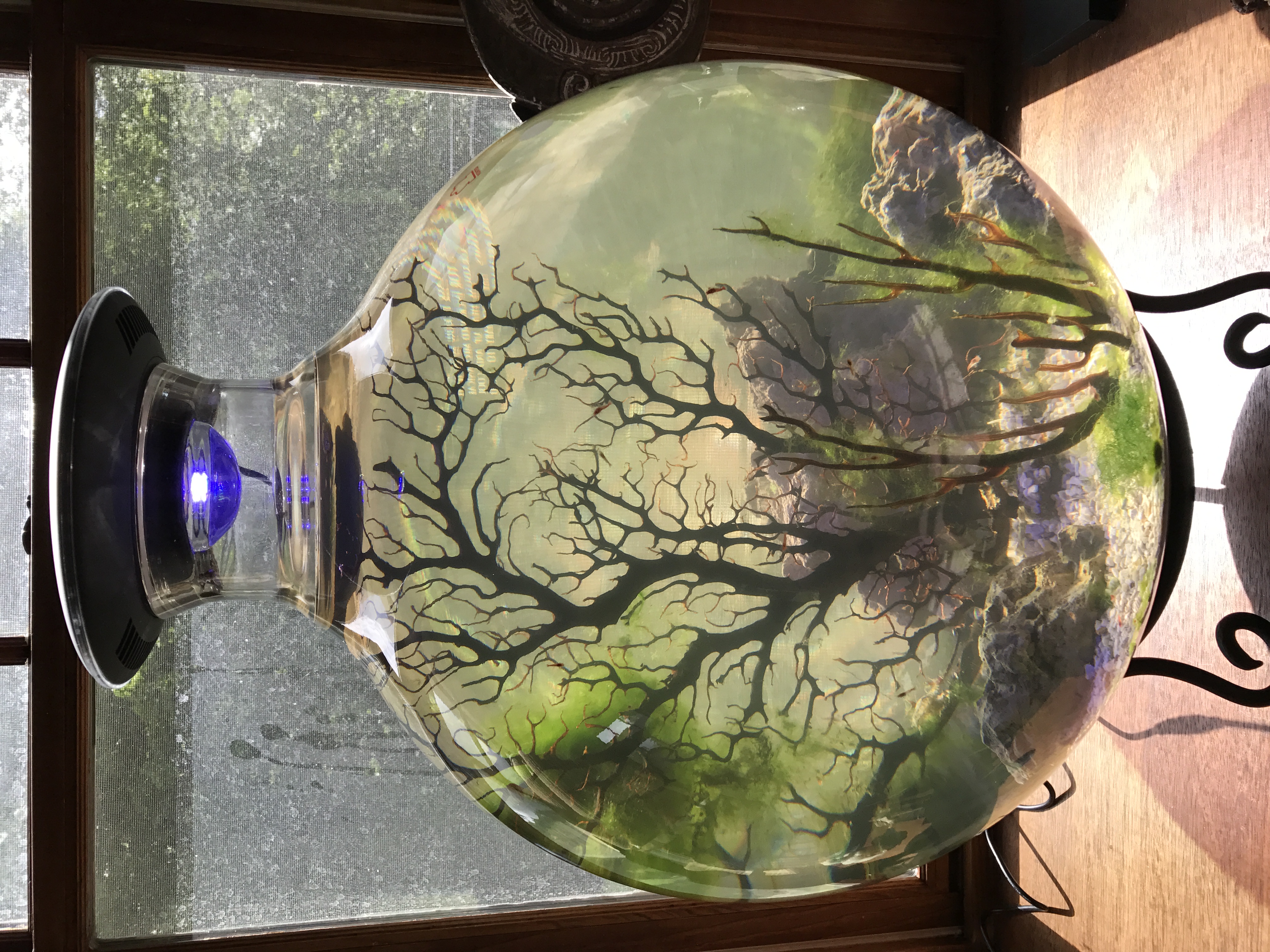 Many thanks for the kind comments. Indeed, the UFO from Zetlight is almost a perfect fit for the sphere and has the added benefit of forming a reasonably tight fit with the top preventing evaporation. It's also water proof so moisture penetration shouldnt' be an issue. Re: getting the contents through the top, it wasn't that hard. I soaked the sea fans overnight to get them pliable enough to bend/fold into the opening and I broke up the stone/coral so it would fit the opening. I'll post some more pictures tomorrow as I just introduced the shrimp and some additional snails & algae. Stay tuned