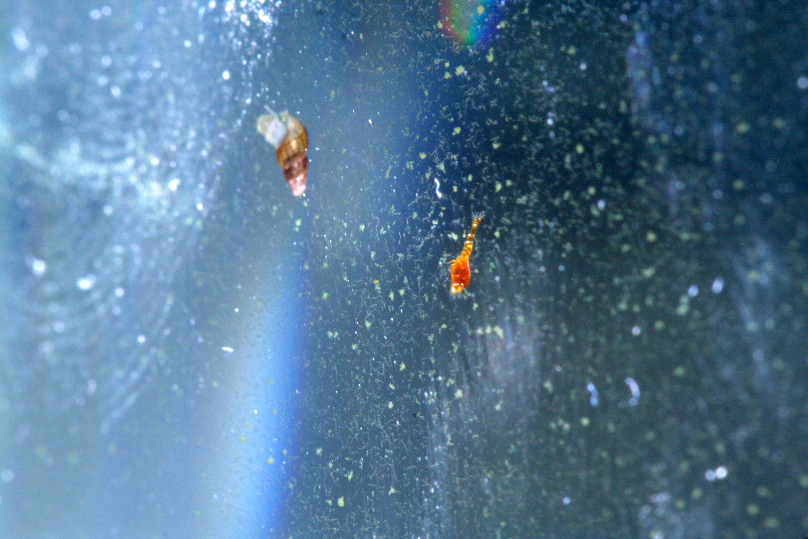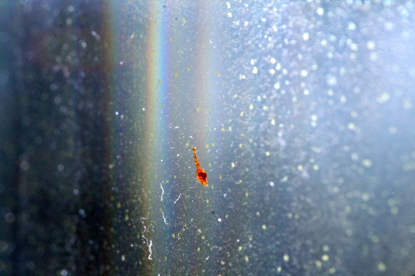 In any case, the larvae finally became free swimming on Sunday. And they are, as expected, orange! Here are some pics. In the third picture you can actually see some tiny eyes. Sorry for the low quality of the pictures, but the container they are in is very small and I never clean the glass (hence all the tiny algae growth obscuring the pictures).