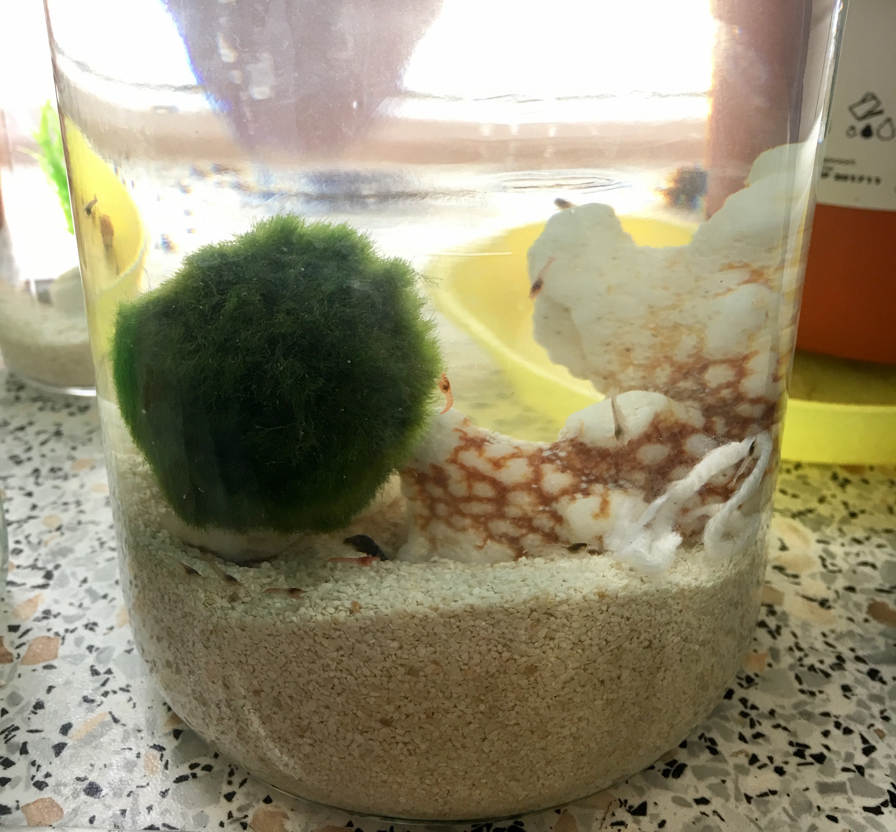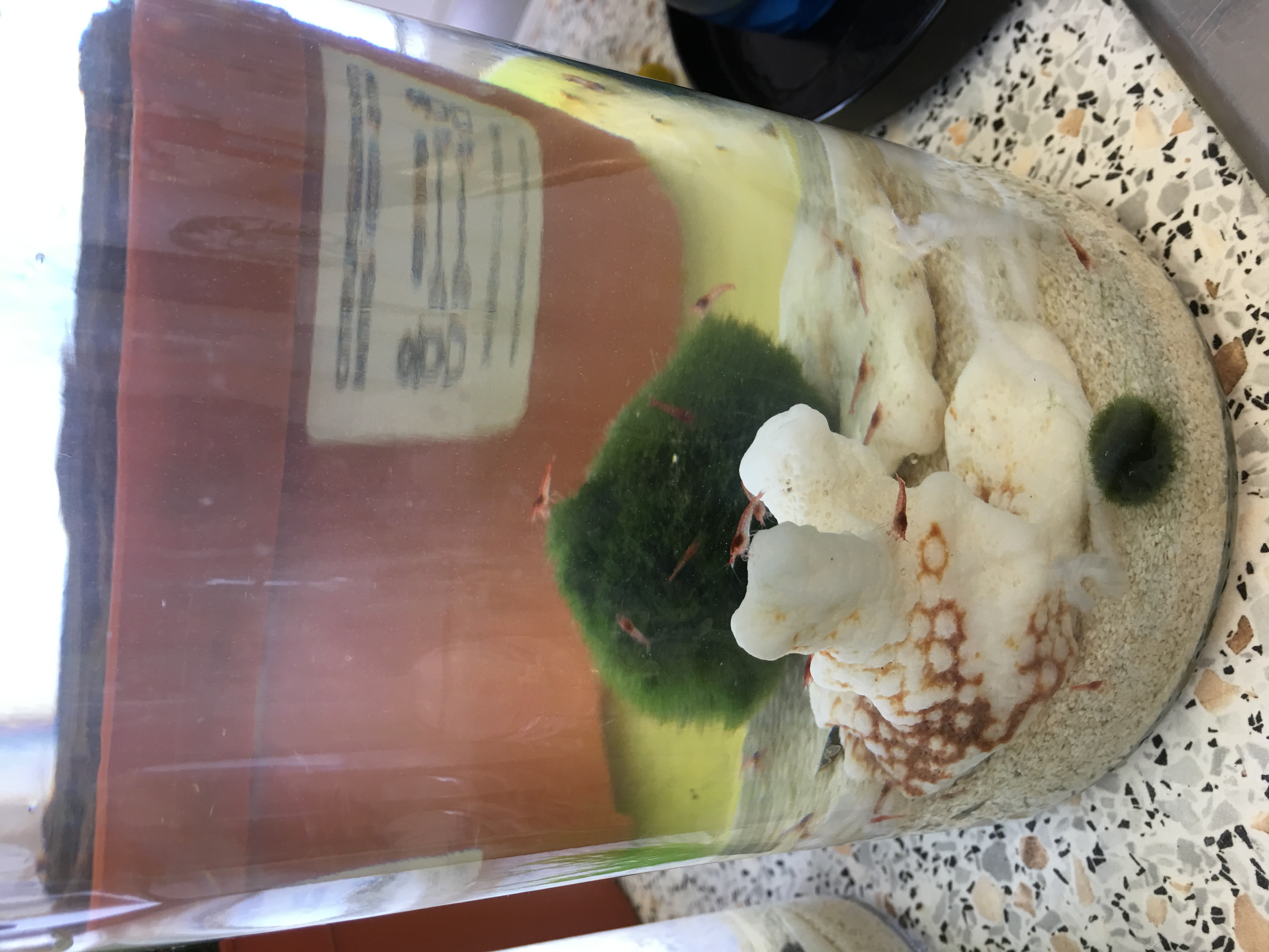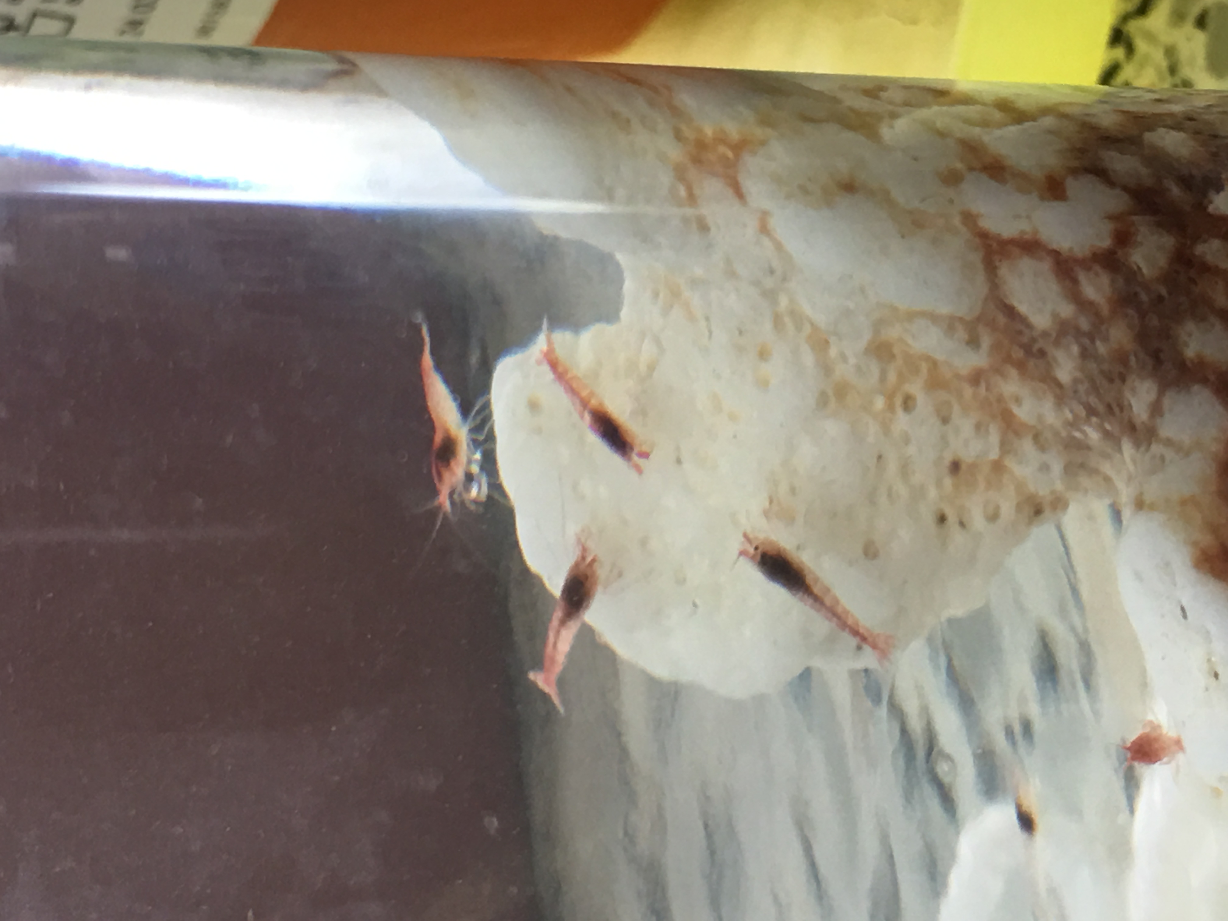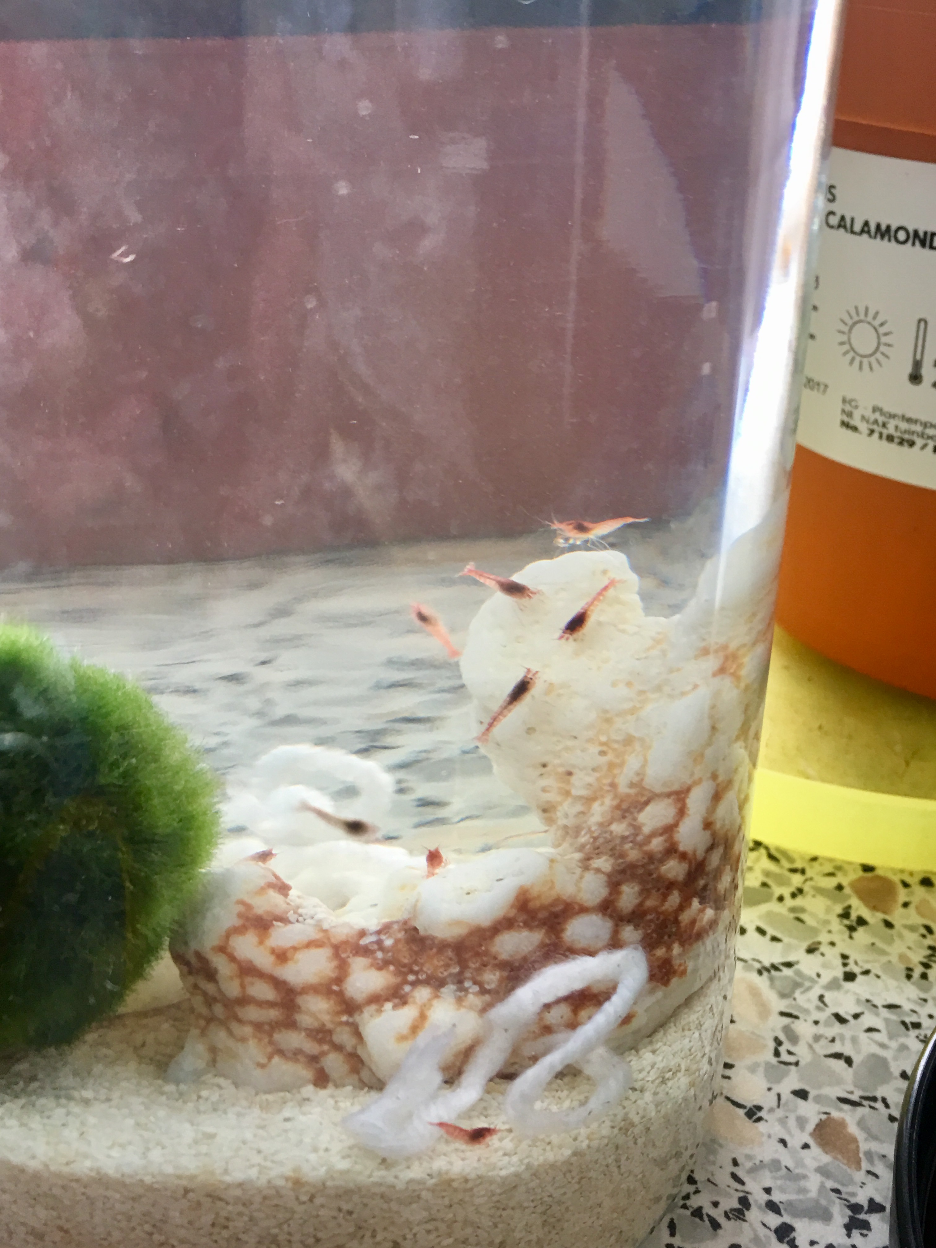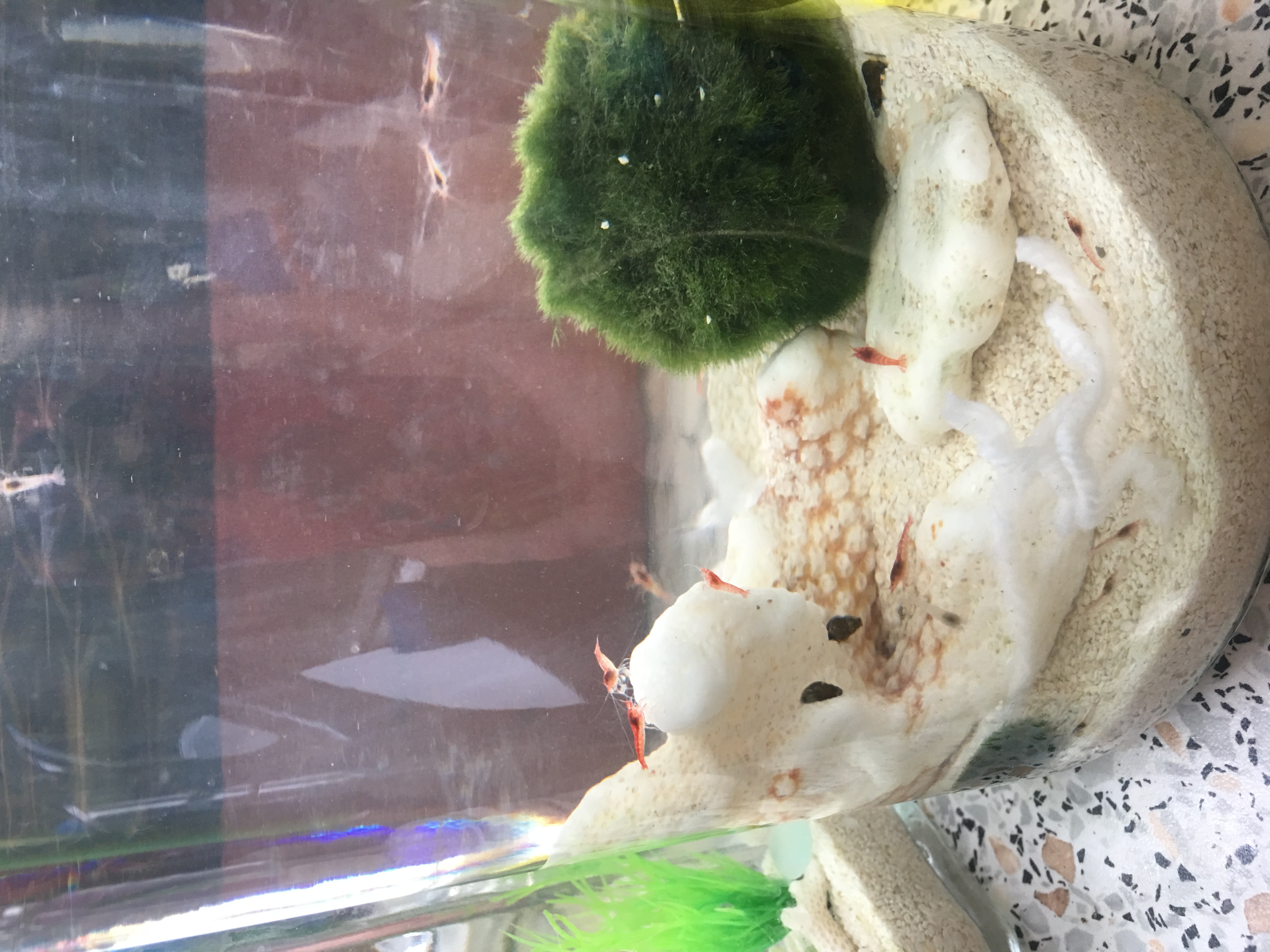 PS, I removed two molts earlier today, and I see two more in the tank. I actually have all the shrimp in a 3-Liter tank now, although I intended to use this one as a backup and put them into my 5-liter. The 5-liter, though, was cloudy and made me nervous. I changed out the water in that one, keeping the decorations, and put 5 snails in with a marimo ball I've had for two weeks. The snails in that refreshed tank are still at the bottom. It's the snails that are in with the shrimp in the 3-liter tank that are heading for the top. The shrimp are still mostly red and very active.