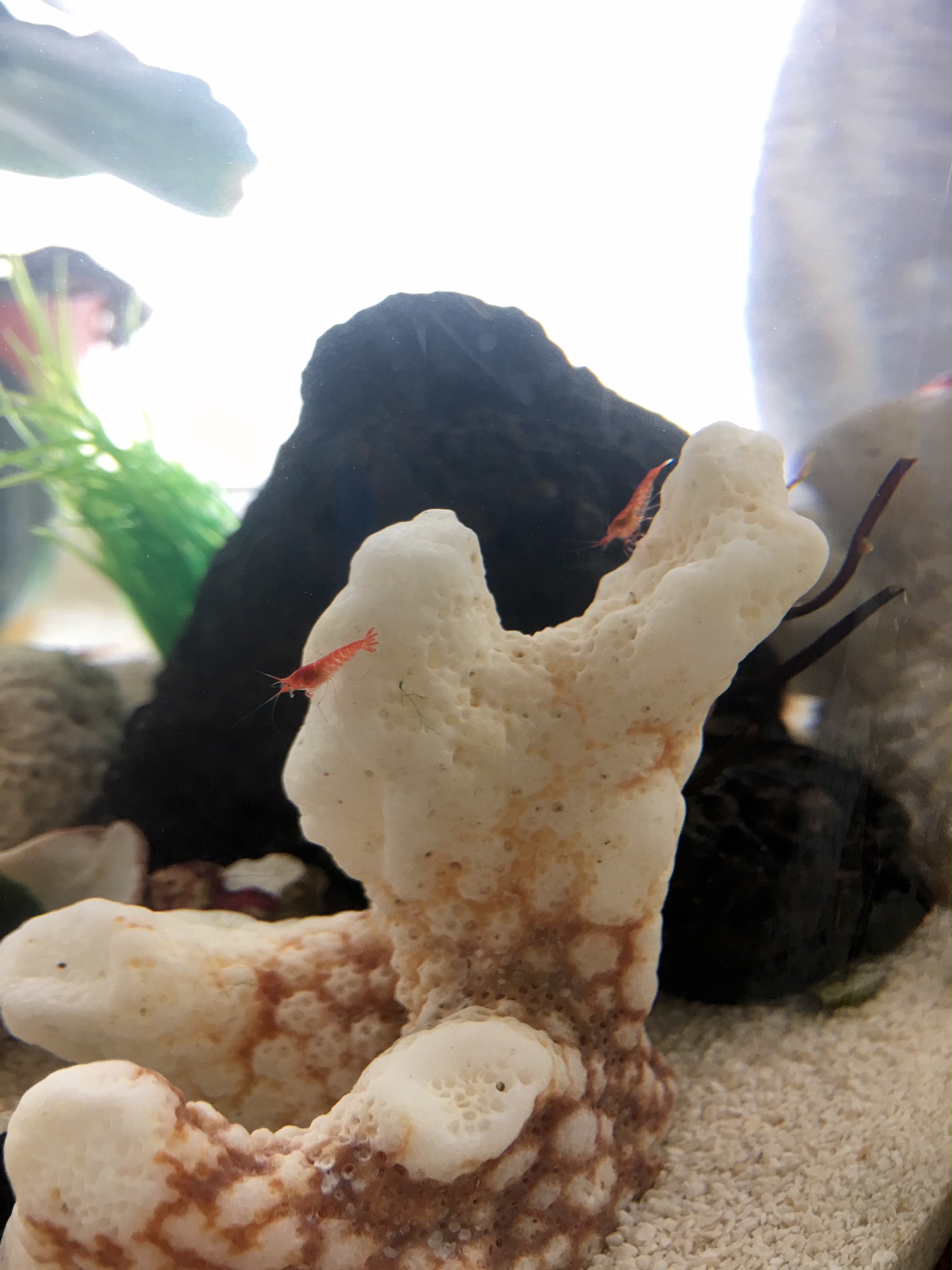 My shrimpies are all looking healthy and happy, and I switched them out of the standby tank I had them in back to the one I had always hoped to keep them in. It is 5 liters. All of the lava rock and corals are finds from when I lived on Oahu.