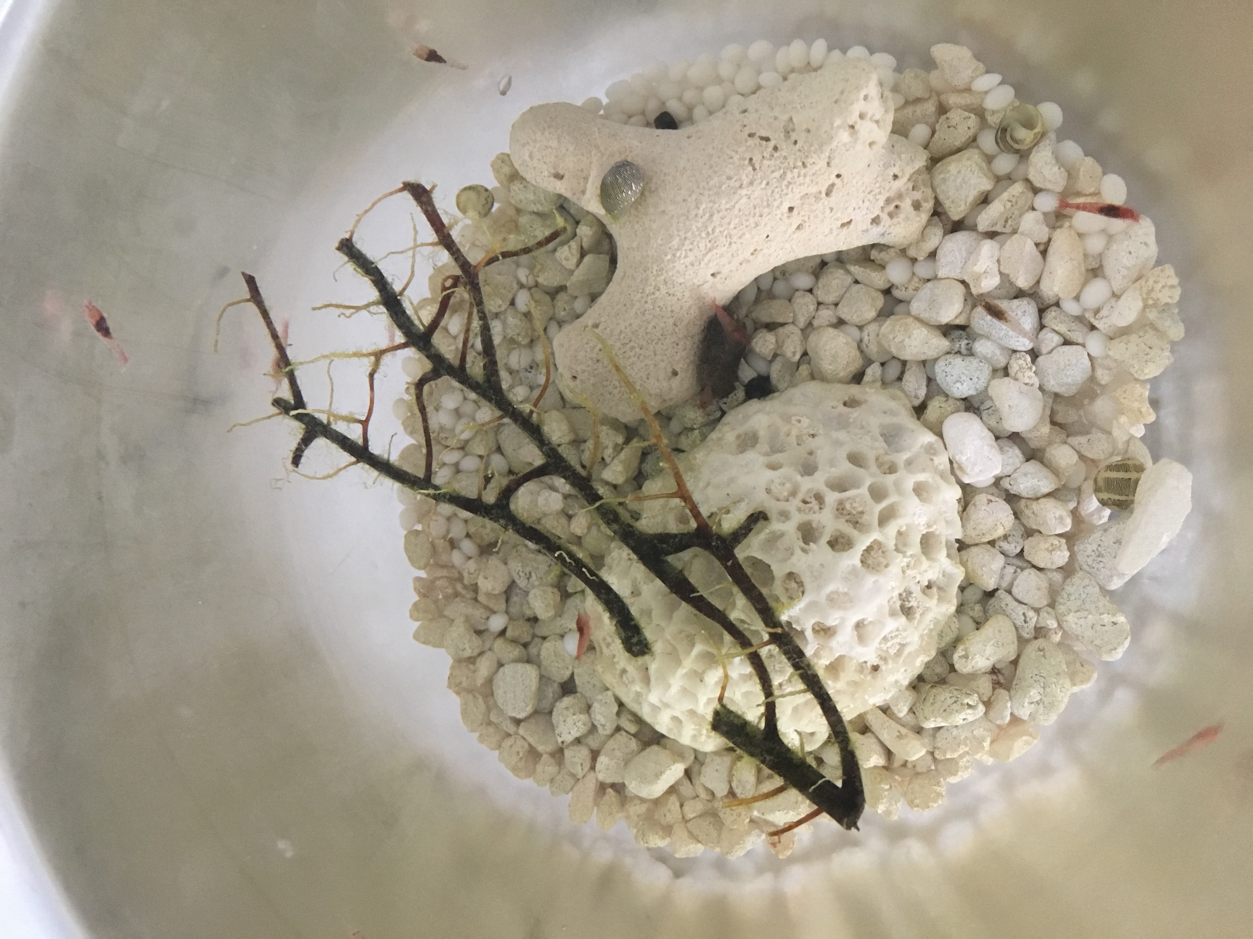 I have 12 super shrimps in it. The brown thing is a seafan or something that was in the ecosphere with some of my shrimps. I thought I had a bunch of algae bc it’s growing all over the seafan thing and bc the walls look a little brown. I have recently given them a shrimp pellet that I drop in and then remove after an hour. I’m going to try and attach better pictures.