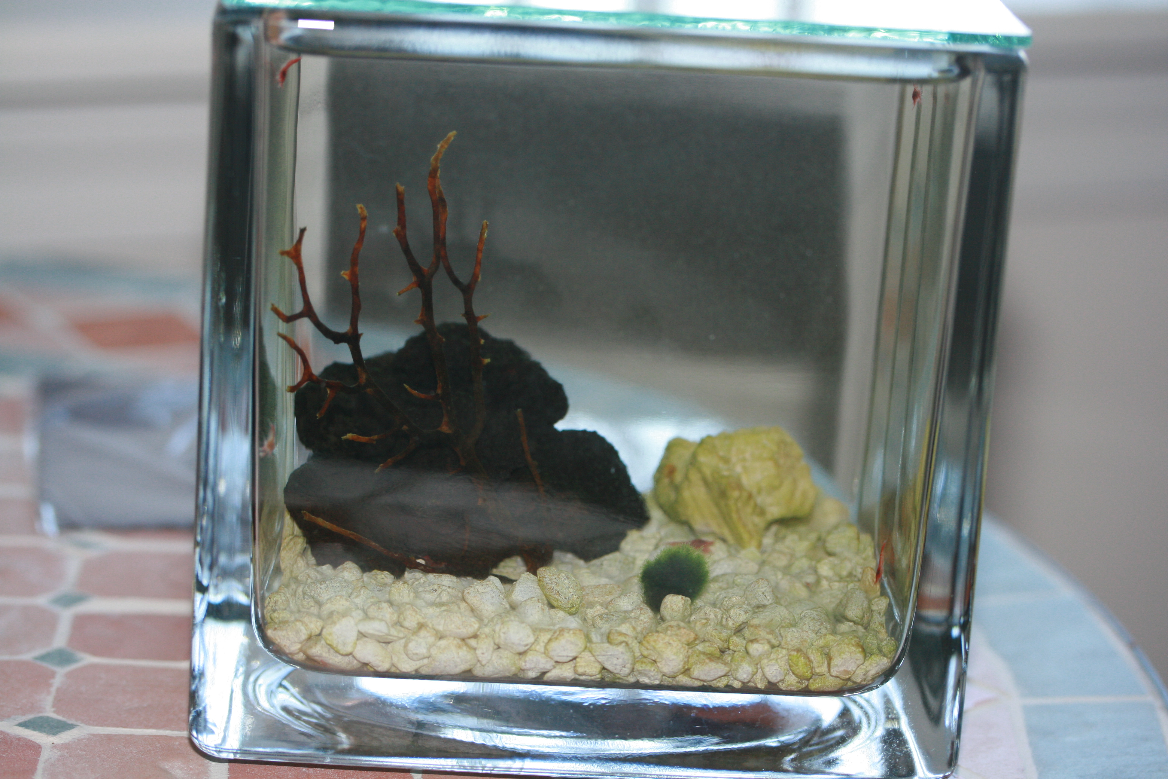 The picture below is the smaller tank, which I think I got in March or April. I moved my original shrimp batch into it (they had formerly been in the larger tank pictured further below that now houses my more recent shrimp batch). This is a 5X5 inch cube (external measurements).