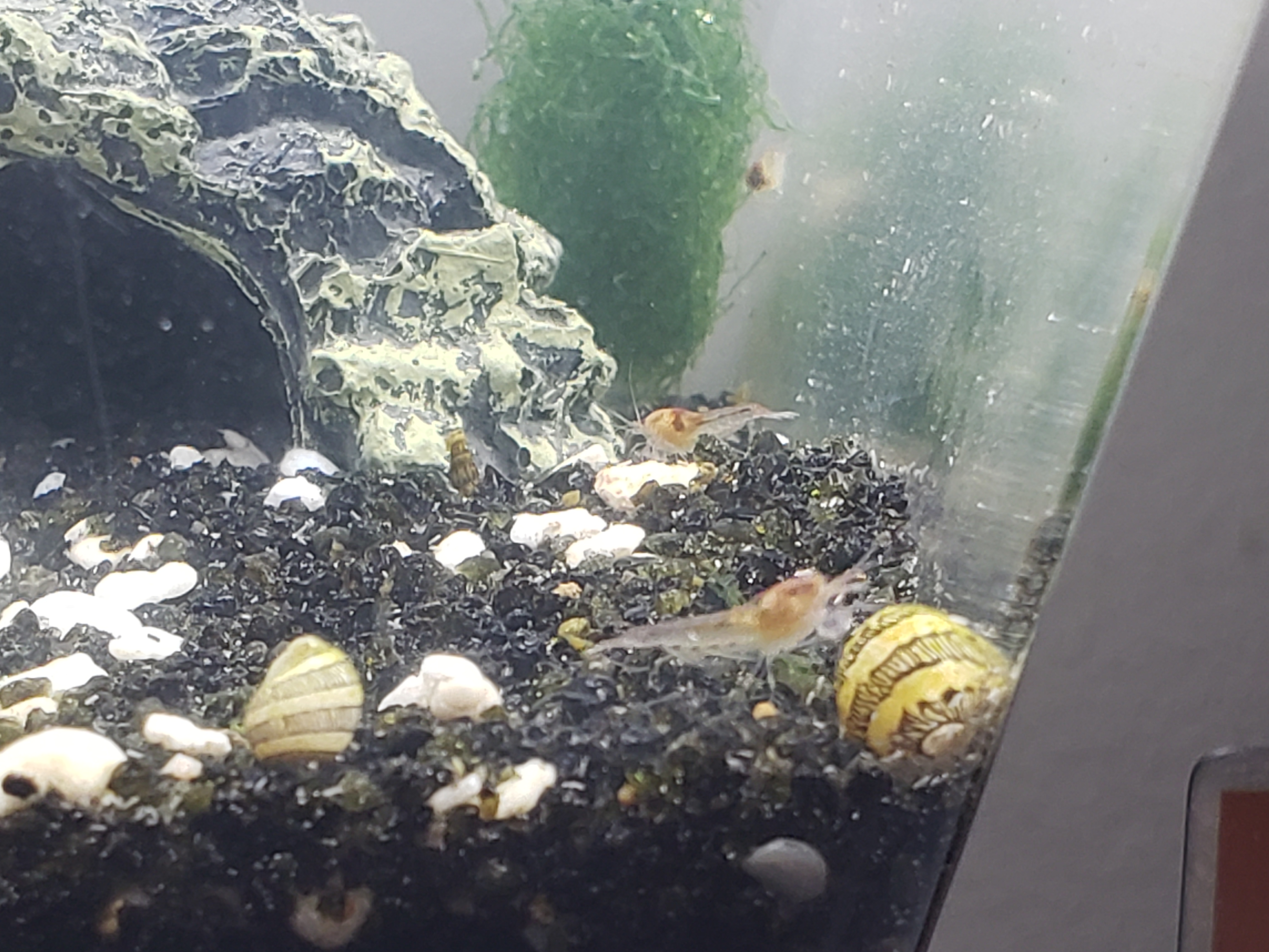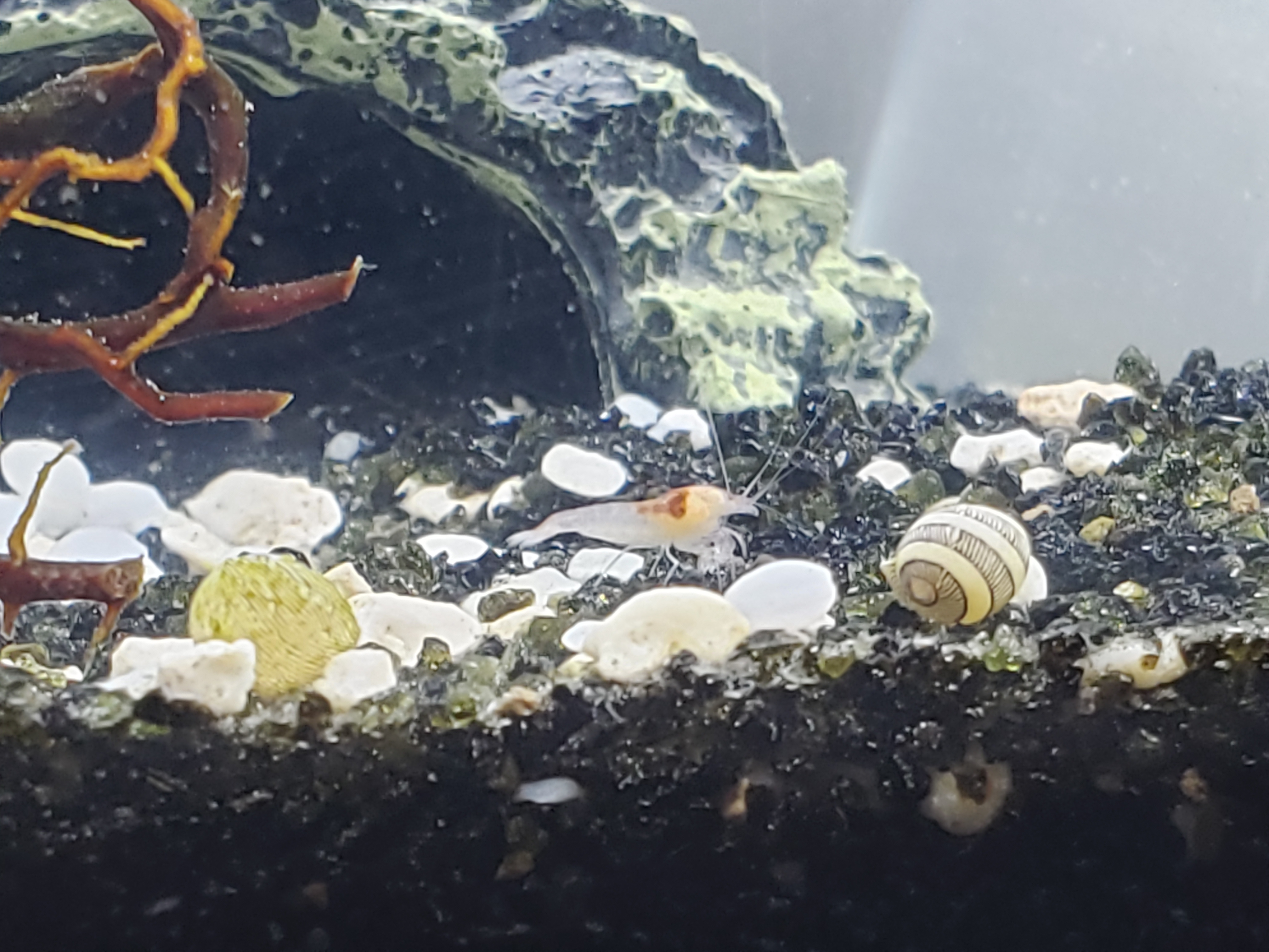 Exfil complete! It was a little tricky because the sphere had a crack and tiny hole in the top. I had to hold my finger over the hole while prying the plug out. Once done I just dumped the majority of the water and shrimp in to the new tank. They were pretty fired up for 2 days. Swimming all over the place. They have settled down now and seem to be liking the new home. I have an order in for 14 more shrimp, snails, moss ball etc but it's still very cold here so I expect it's going to be a while before they can ship. Pics attached. I added the sea fan? from the ecosphere. Thoughts?