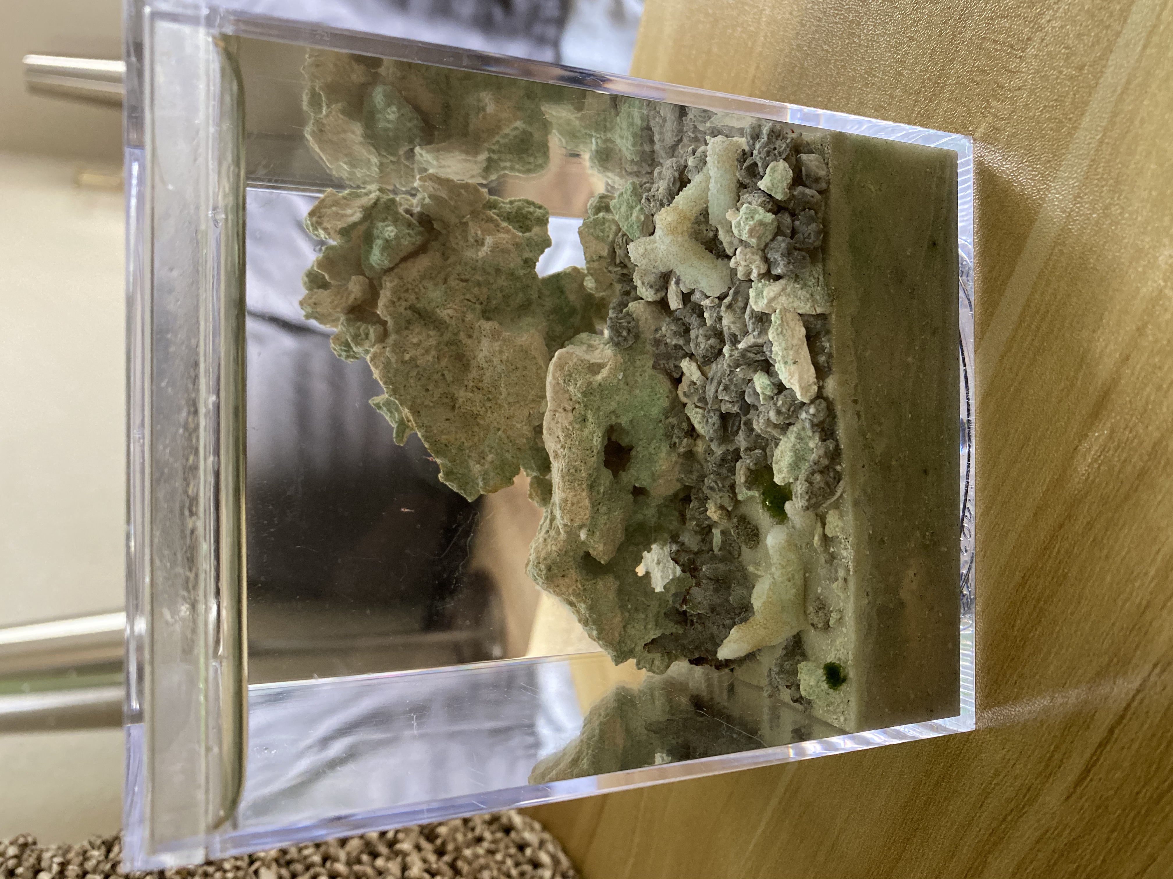 Background: I moved recently, so I combined the shrimp from two one-gallon tanks into a single one gallon tank. Even though the other tank was emptied of shrimp, I left it mostly intact- substrate, coral rock base, sea fan, even the brackish water and snails have been left in there, as is. Just the opae ula were removed and combined into the other tank.