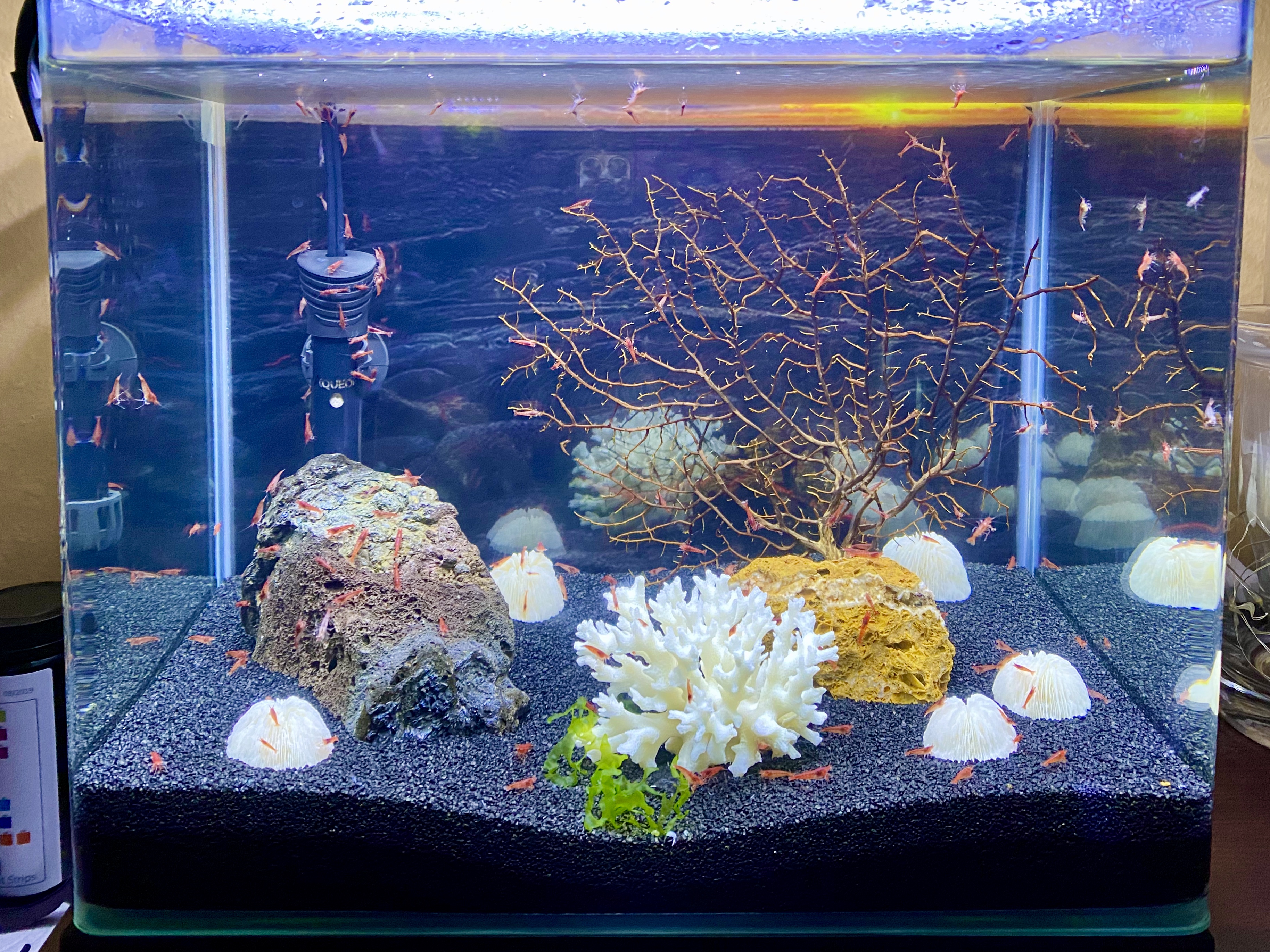 I have tested the distilled water, and it is clear. I’ve had nitrites and nitrates go up, which is understandable, but why am I getting chlorine readings? I have lost a total of 6 shrimp since the the start, which I think is pretty good, but does anyone have any idea how I’m getting chlorine in my water? I am slowly bringing my readings down to acceptable levels using Seachem Prime.