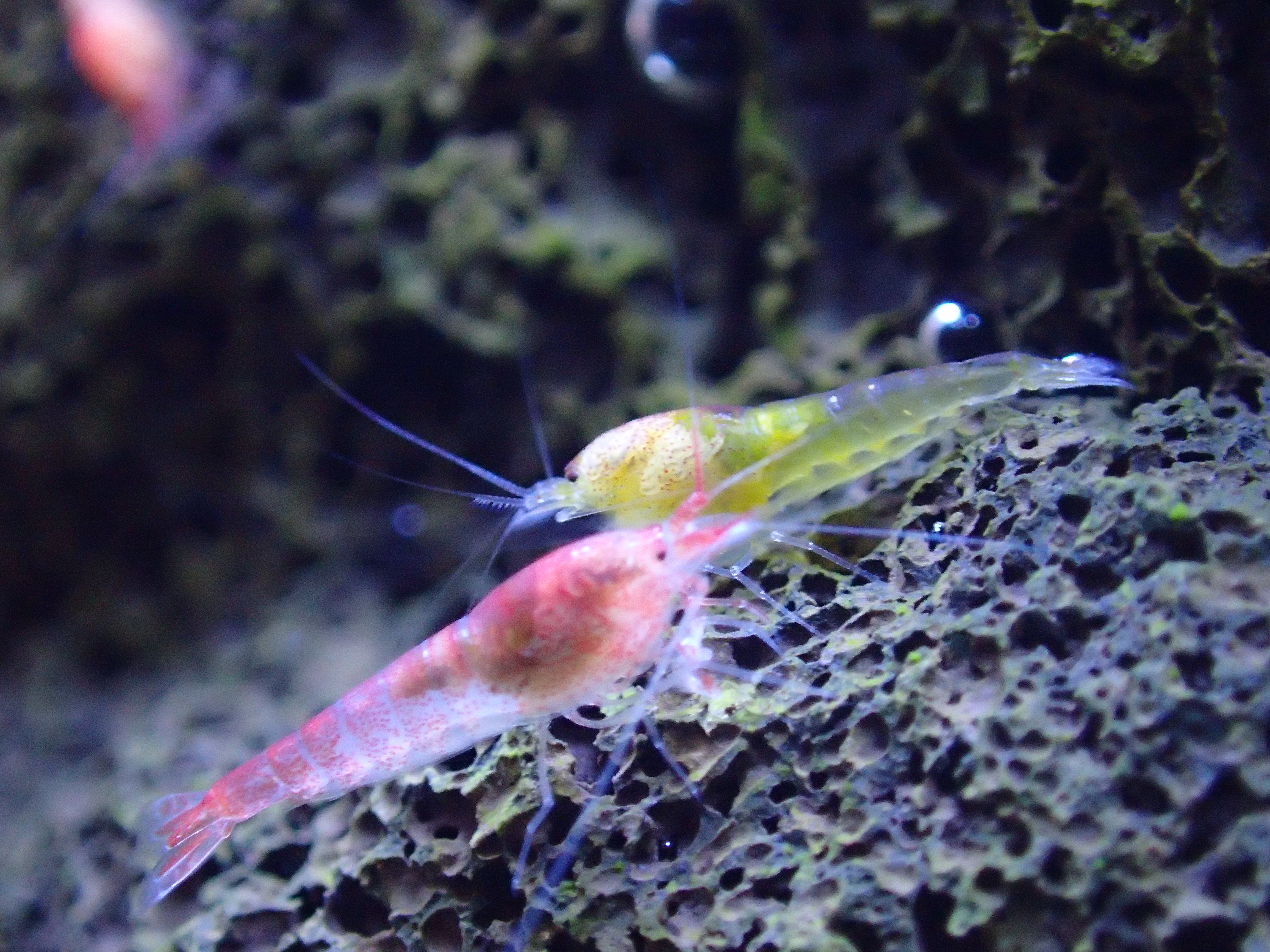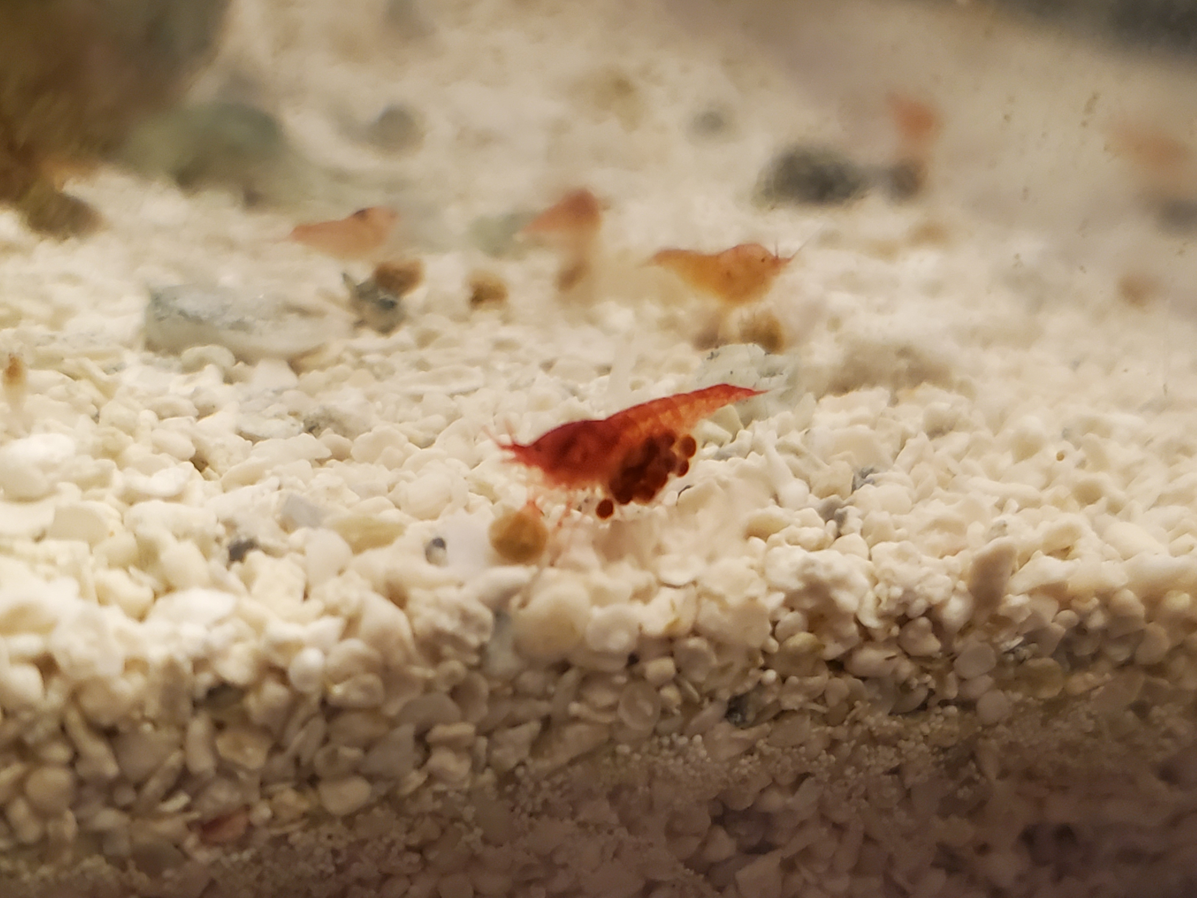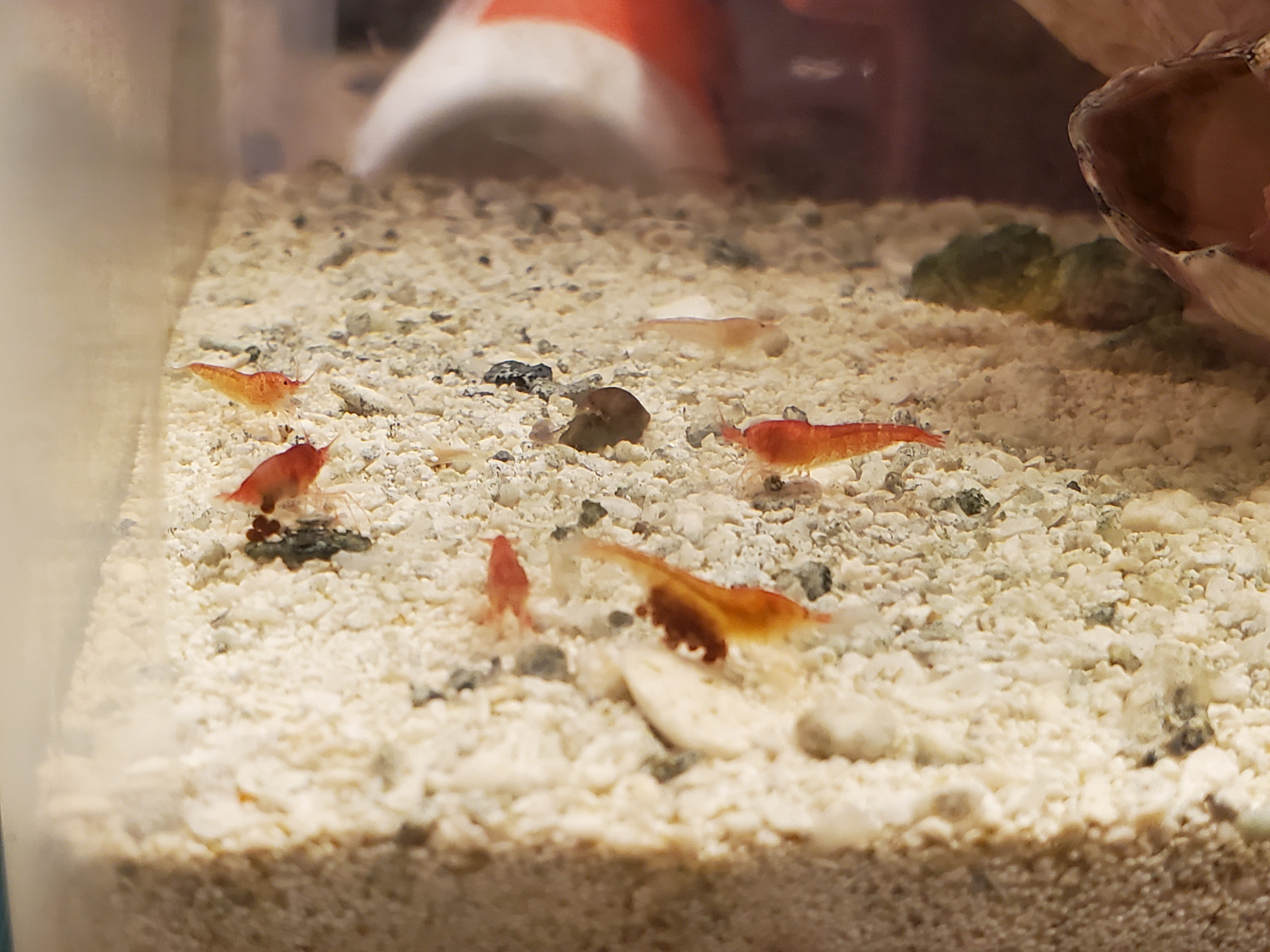 They currently live in a 2.6-gallon tank, the system has been very stable with little visible algea. They are mostly red or red with large white stripe, I have also transiently spotted two individuals with yellowish coloration (I made a post about that a while ago). For 2 years they have shown an active reproductive period from roughly May to October, with several berried females visible at all times. Maybe 50 or 75 individuals ? It's hard to know, there are tons of hiding spots (including a porous ceramic cube, I'd recommend, they love to hide there) in the tank and they have made *so many* babies.