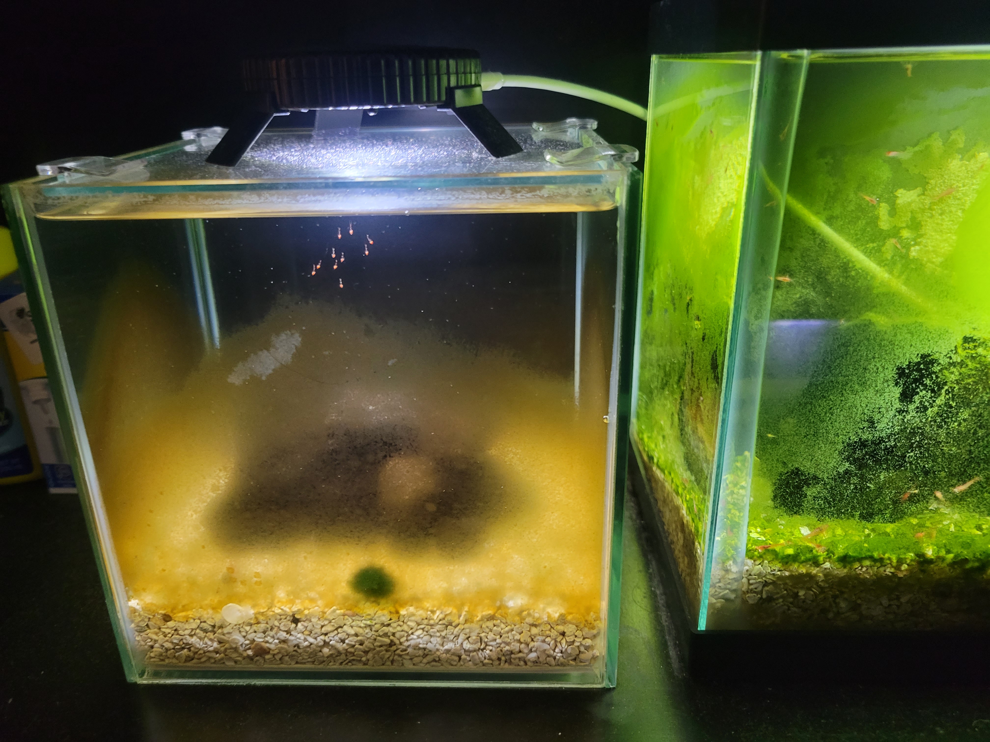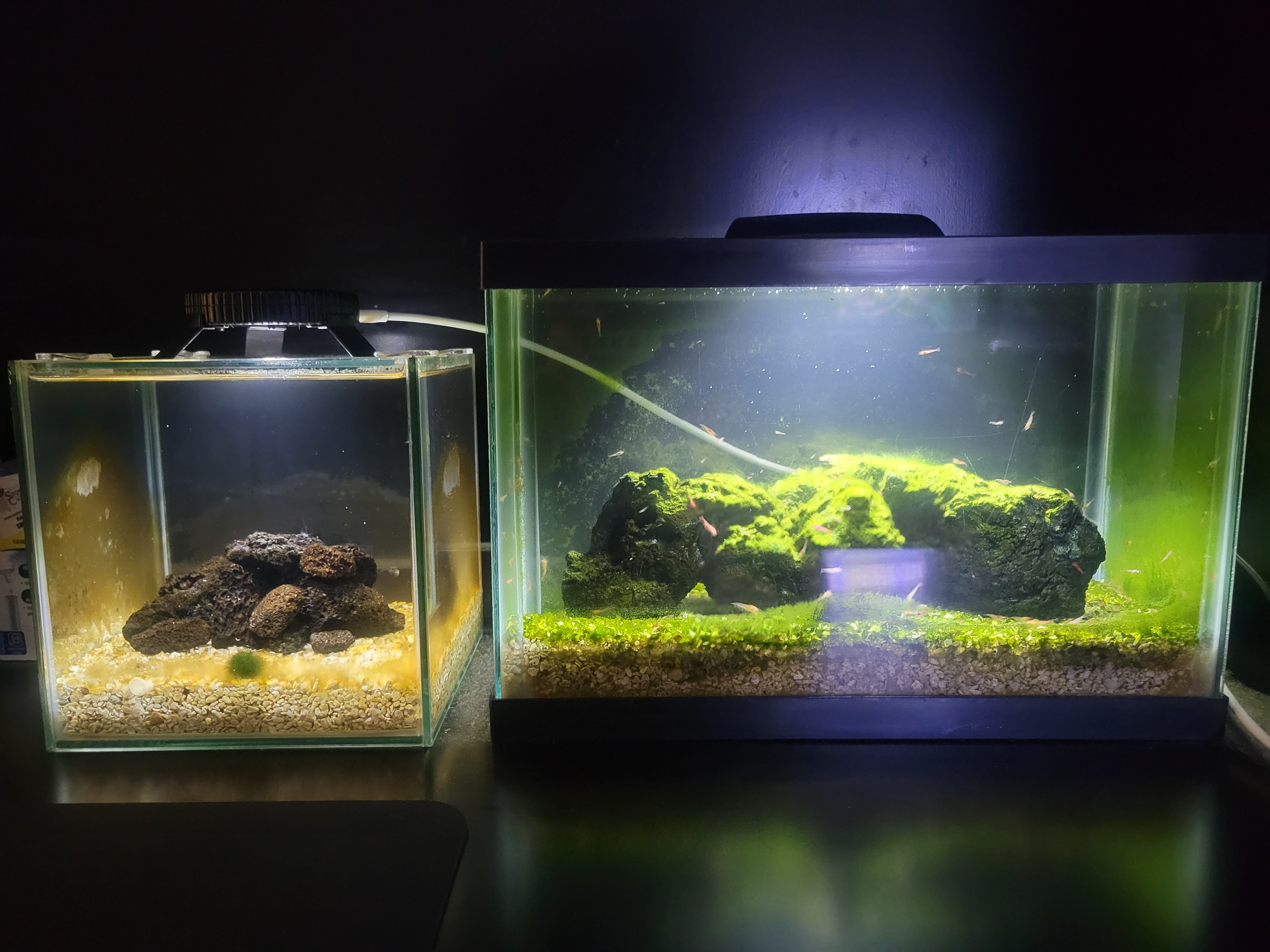 By the way I decided to come back to show the results of me taking the time to clean as much algae from the front glass as much as possible. I didn't mention it before but the 2.5 gallon on the right used to have both a black sea fan and a large ball of hair algae that kind of spontaneously grew out of nowhere. But I realized that both can be harmful one way or another, apparently sea fans can decompose over time, polluting the water, where as hair algae tangles up the shrimp often, especially the larvae. The only reason why I chose to do it was because I was already intending to capture 10 today to sell to someone later today, including one of the orange "baby" shrimp offspring. By the way, the orange offspring seem to be fine, they mostly hide within the lava rocks but I see a few come out on occasions. So I figured since I already caused them to stress out that I'd take it as the opportunity to remove some of the excess algae as well.