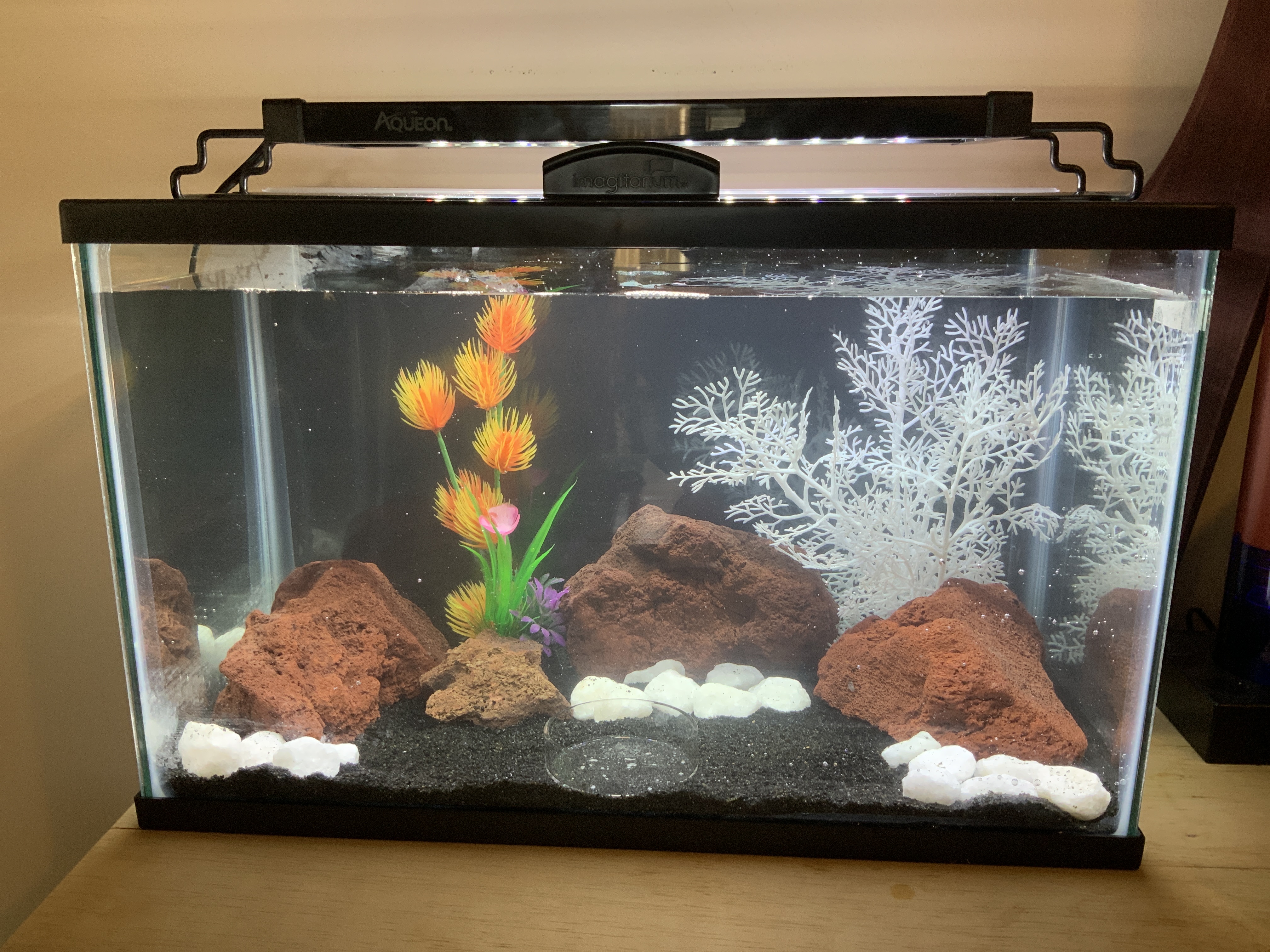 Thanks, John. It’s filled to 1 inch from the top, so I don’t think I should add any more. I marked the water line with a white label on the side so I’ll know when I have to add more water. I have the light on a 12 hour timer. Now I just have to wait for the algae to appear before ordering my shrimp. My little supershrimp moss ball has floated to the surface. I took the photo before I added it and the macroalgae, which looks like a tumbleweed. The waiting is the hardest part! :D